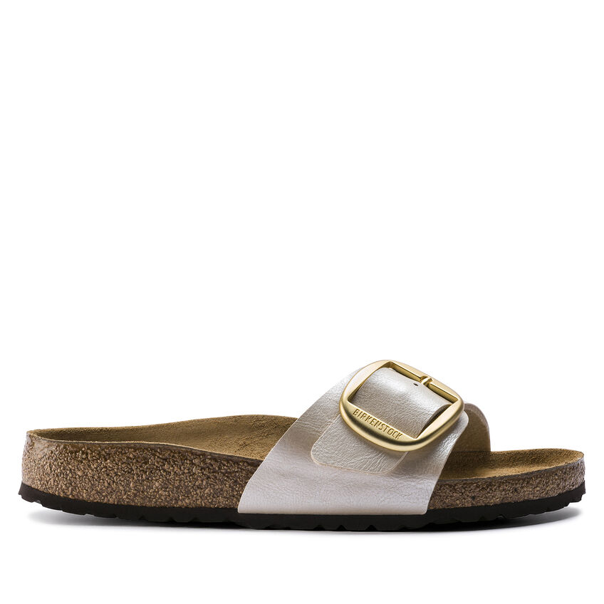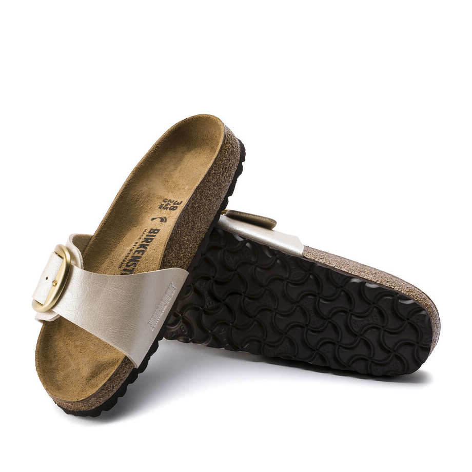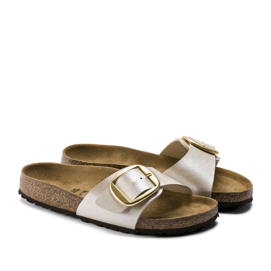 Birkenstock Madrid Big Buckle Graceful bianco perla. Birkenstock Madrid è un classico assoluto che piace soprattutto per la sua linea essenziale. Questa versione combina nello stesso modello due motivi di grande successo. Si presenta con un delicato rivestimento dalla brillantezza setata e una grande fibbia ad ardiglione elegante. La tomaia è realizzata in materiale sintetico Birko-Flor®, resistente e delicato sulla pelle.
