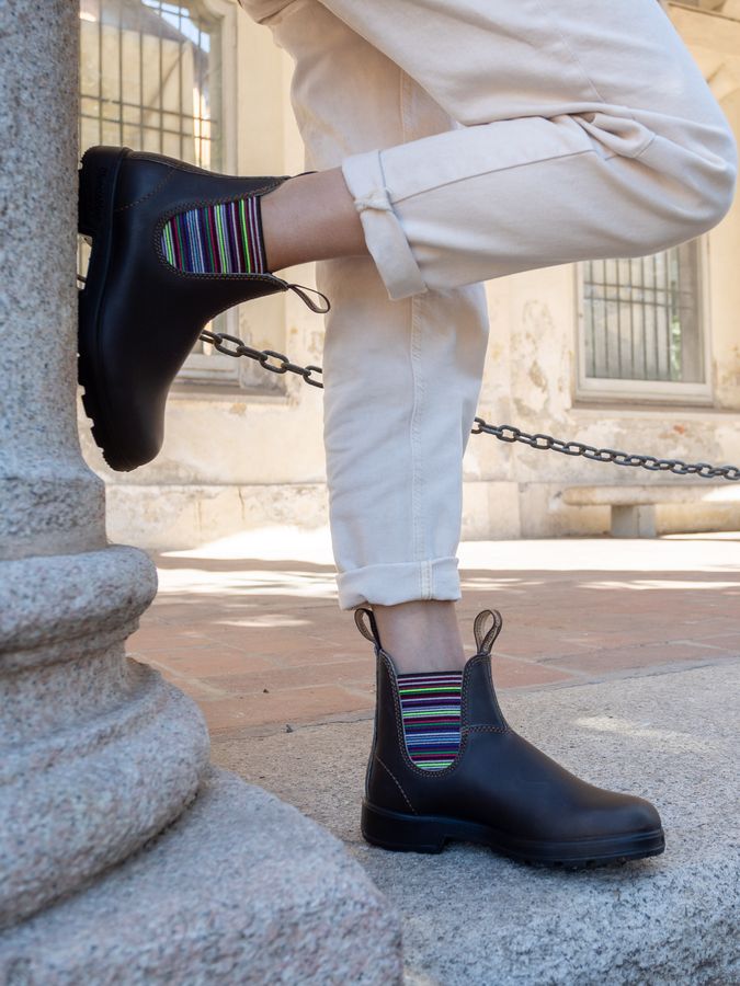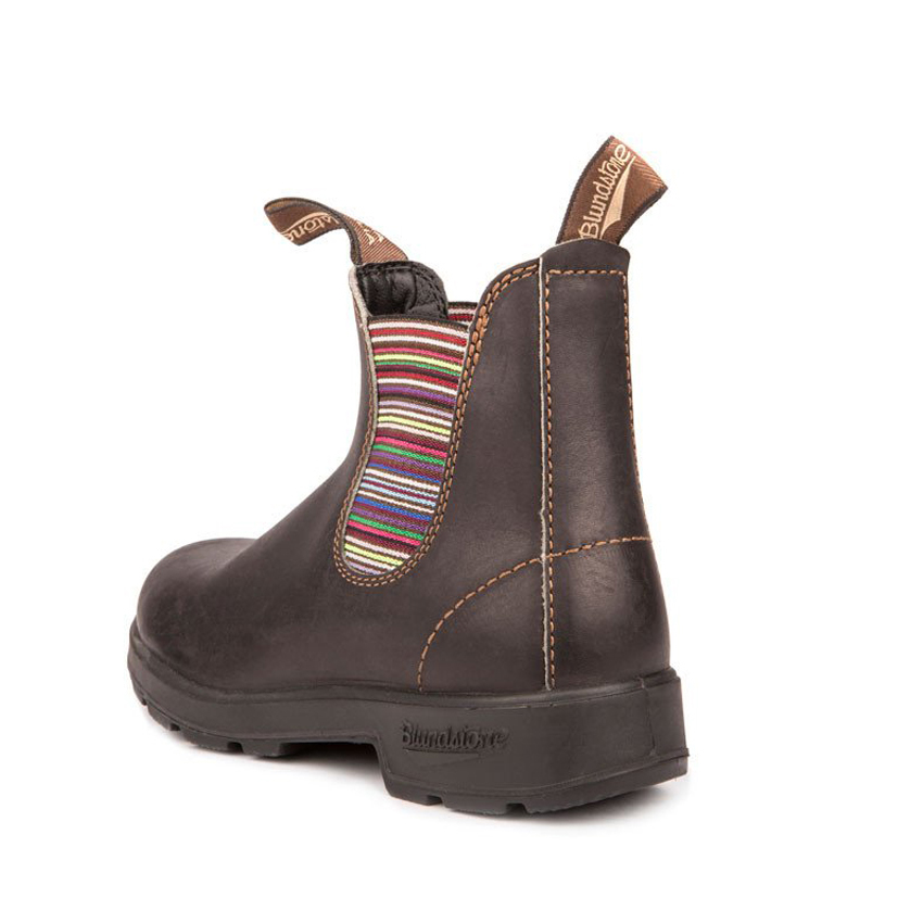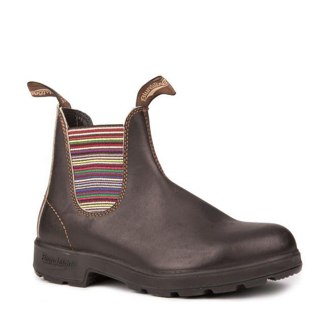 # 1409 ORIGINALS STOUT BROWN & STRIPES Con la loro tomaia in pelle marrone premium resistente all’acqua e il pratico elastico multicolor, gli stivaletti Blundstone #1409 sfoggiano uno stile di grande tendenza. Lo stivaletto Blundstone #1409 si distingue per il design classico e il tocco di glamour dato dagli elastici a righe colorate. Sono realizzati in pelle liscia marrone scuro resistente all'acqua. Dotati di linguetta frontale e posteriore per una calzata facile, suola in gomma dentata antiscivolo con tallone rialzato. Uno stivaletto perfetto per aggiungere un tocco di stile ai tuoi outfit.
