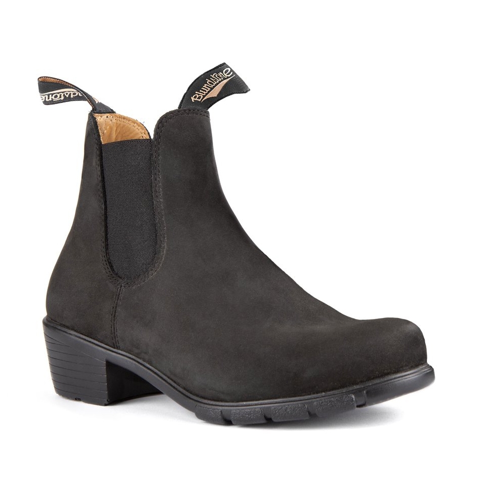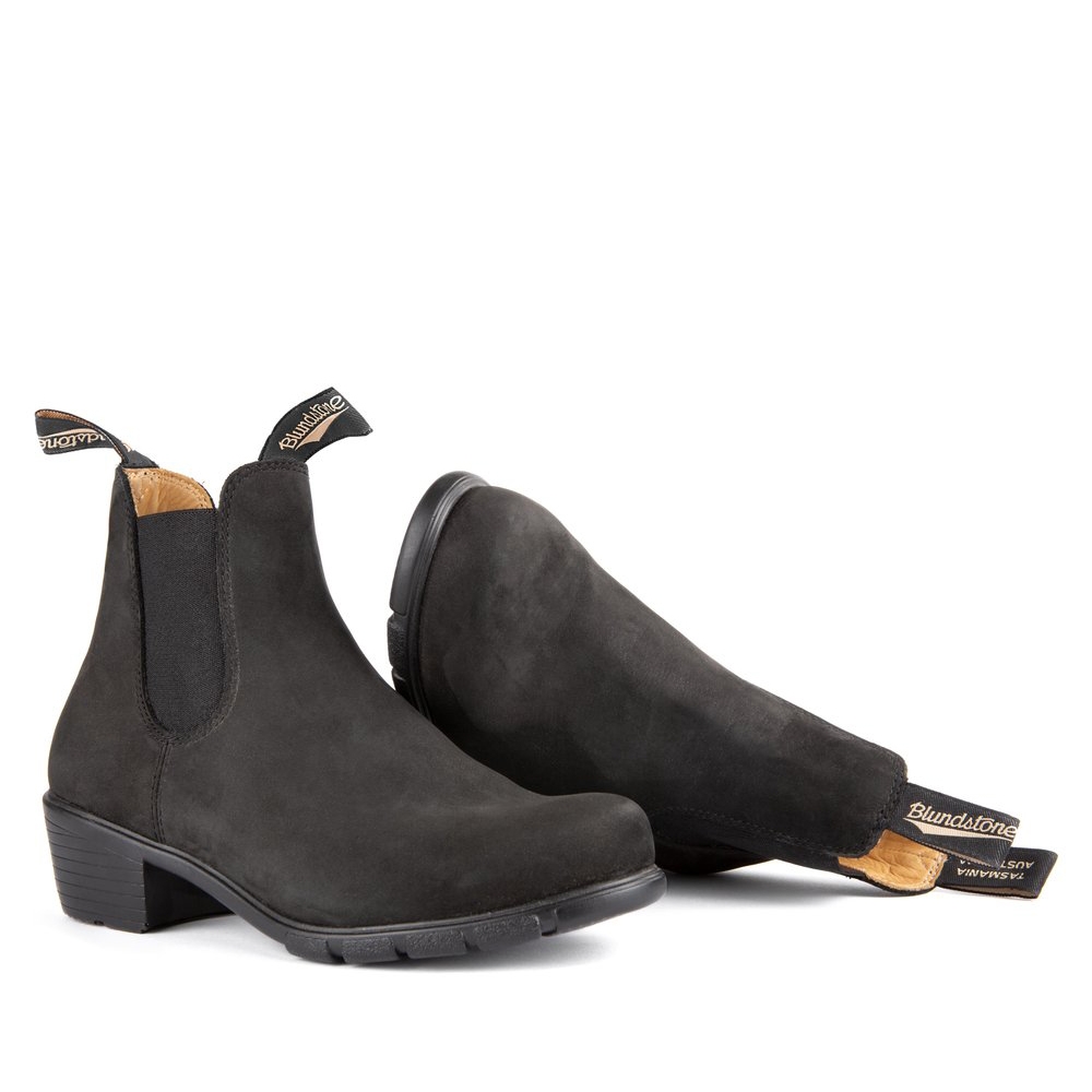 Stivaletti da donna con il tacco alto 5 cm Blundstone #1960, realizzati in pelle nabuk idrorepellente nera con elastici laterali in tinta. Design in stile Chelsea, presentano suola antiscivolo e tacco con righe intagliate decorative. Dotati di linguetta frontale e posteriore per favorire la calzata. Una scarpa femminile, comoda ed elegante della serie Women, da abbinare a look sia casual che da ufficio.