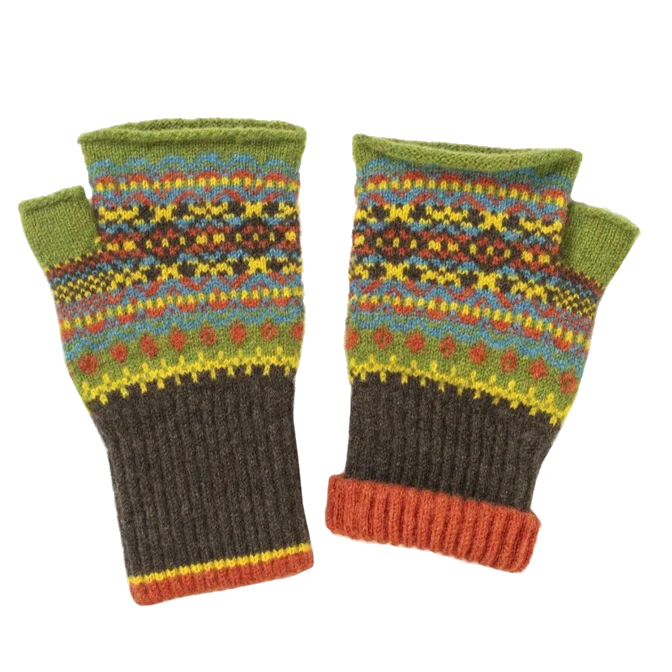 Lana Merino 100% luminosa e colorata, cosa si può chiedere di più? Con geometrie audaci e decori Fairisle in colori a contrasto, questi guanti aperti hanno un polsino interno colorato nascosto. Perfetti per tenere le mani al caldo e pratici. Realizzati in Scozia con lana Merino 100%.