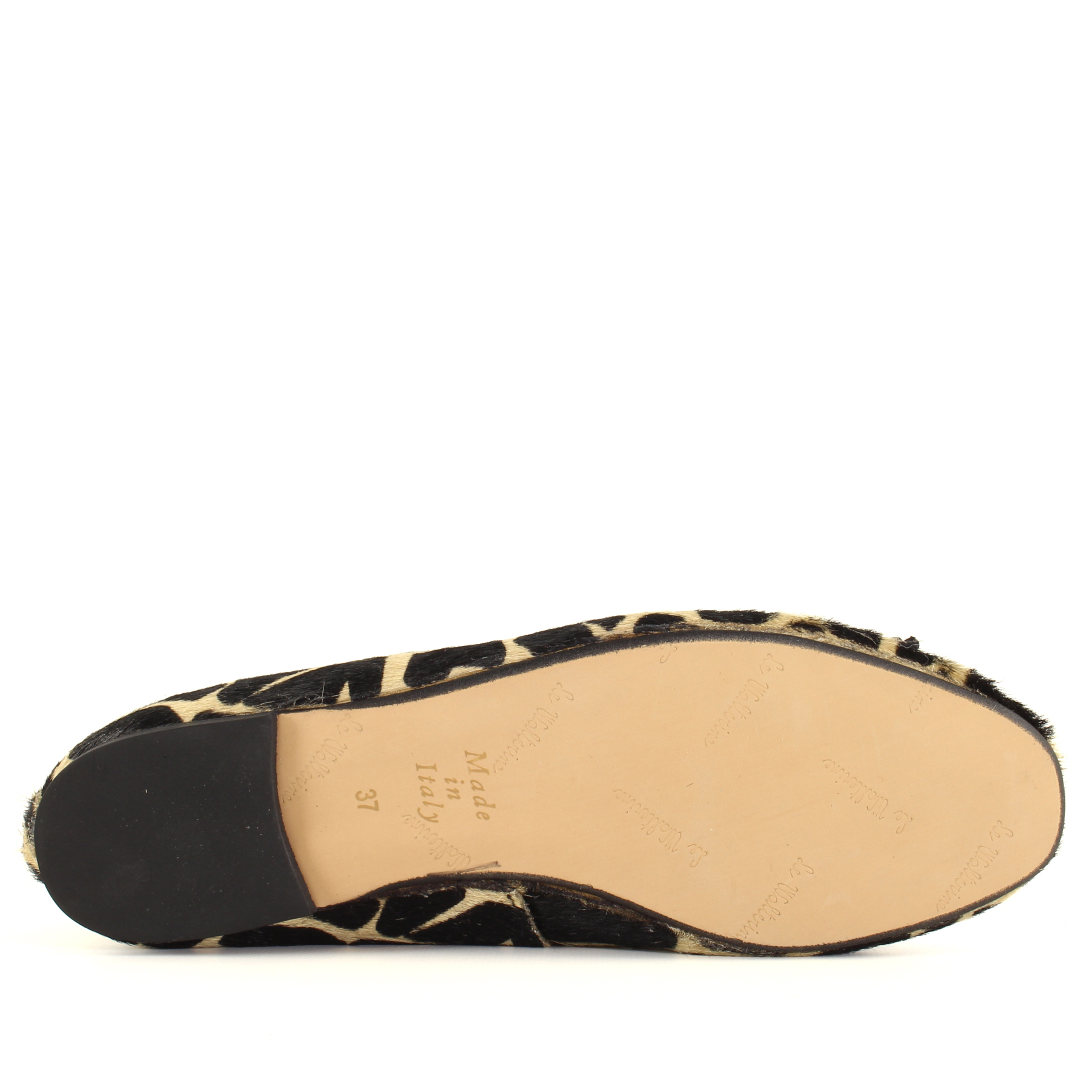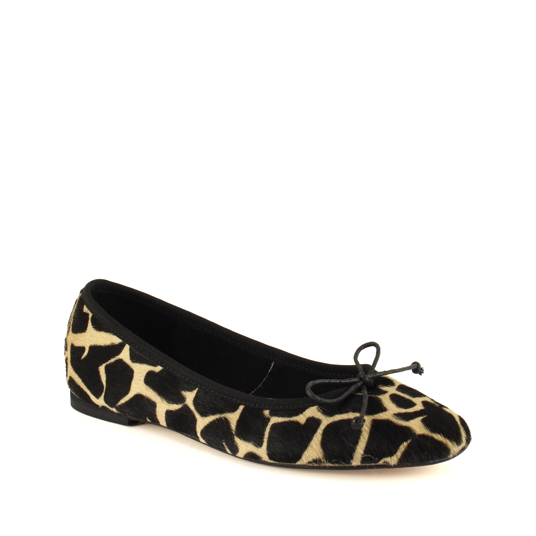 Realizzata in cavallino stampa giraffa, sorprende per il suo equilibrio tra anima selvaggia e raffinatezza sartoriale. La silhouette affusolata, la punta arrotondata e il piccolo fiocco in contrasto disegnano una linea femminile e discreta, mentre la costruzione morbida accompagna il piede con leggerezza e naturale comfort. È una ballerina che non cerca l’eccesso, ma lo sostituisce con personalità autentica e dettagli curati.