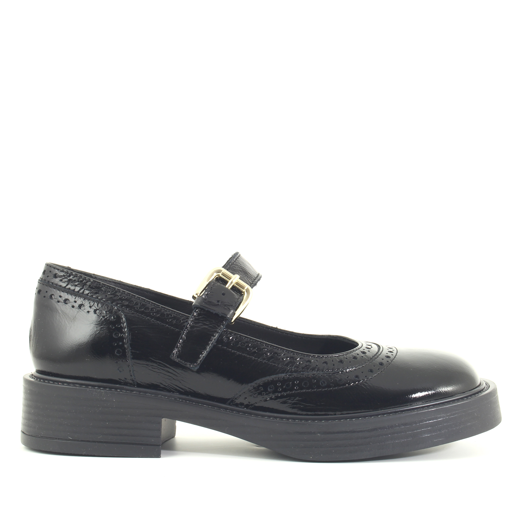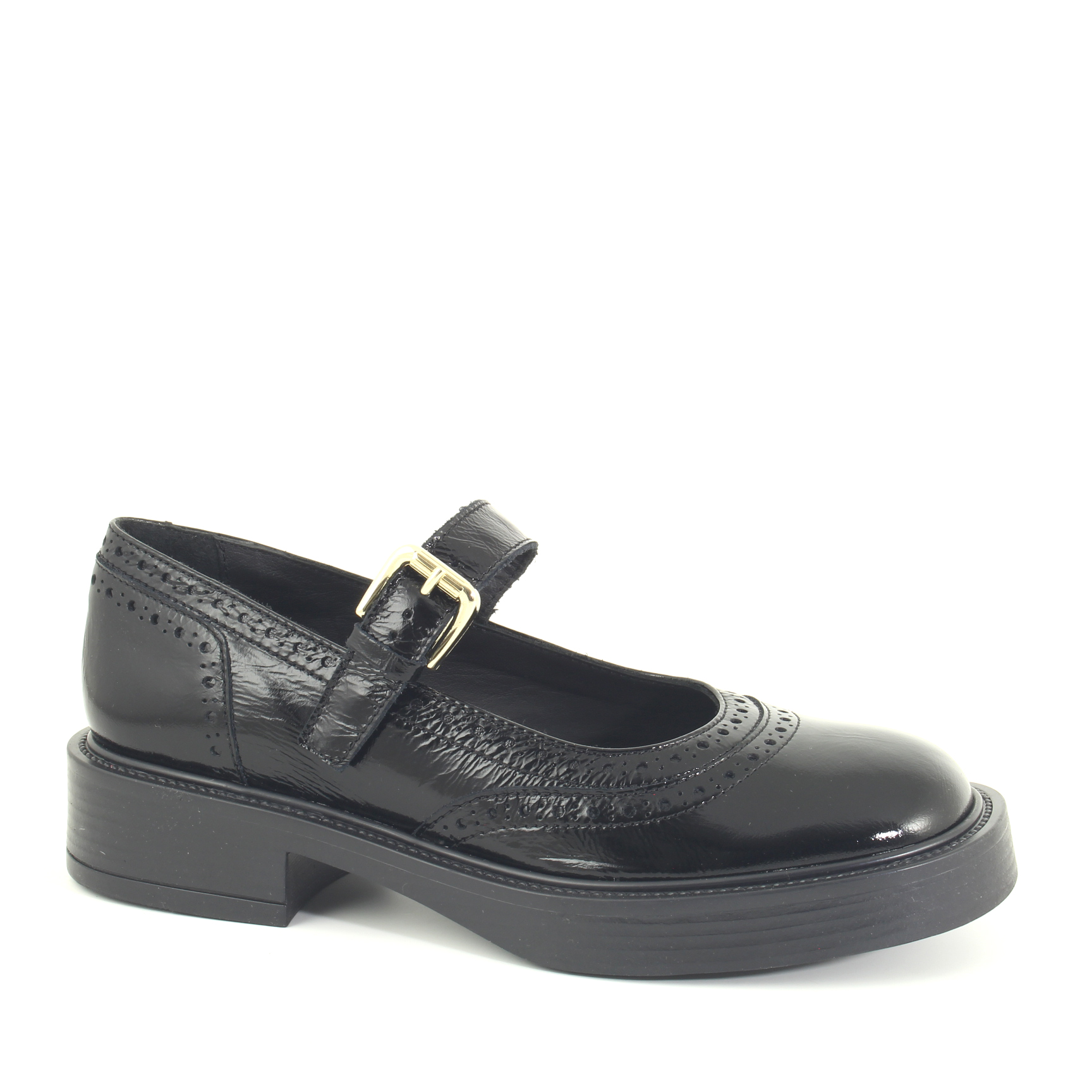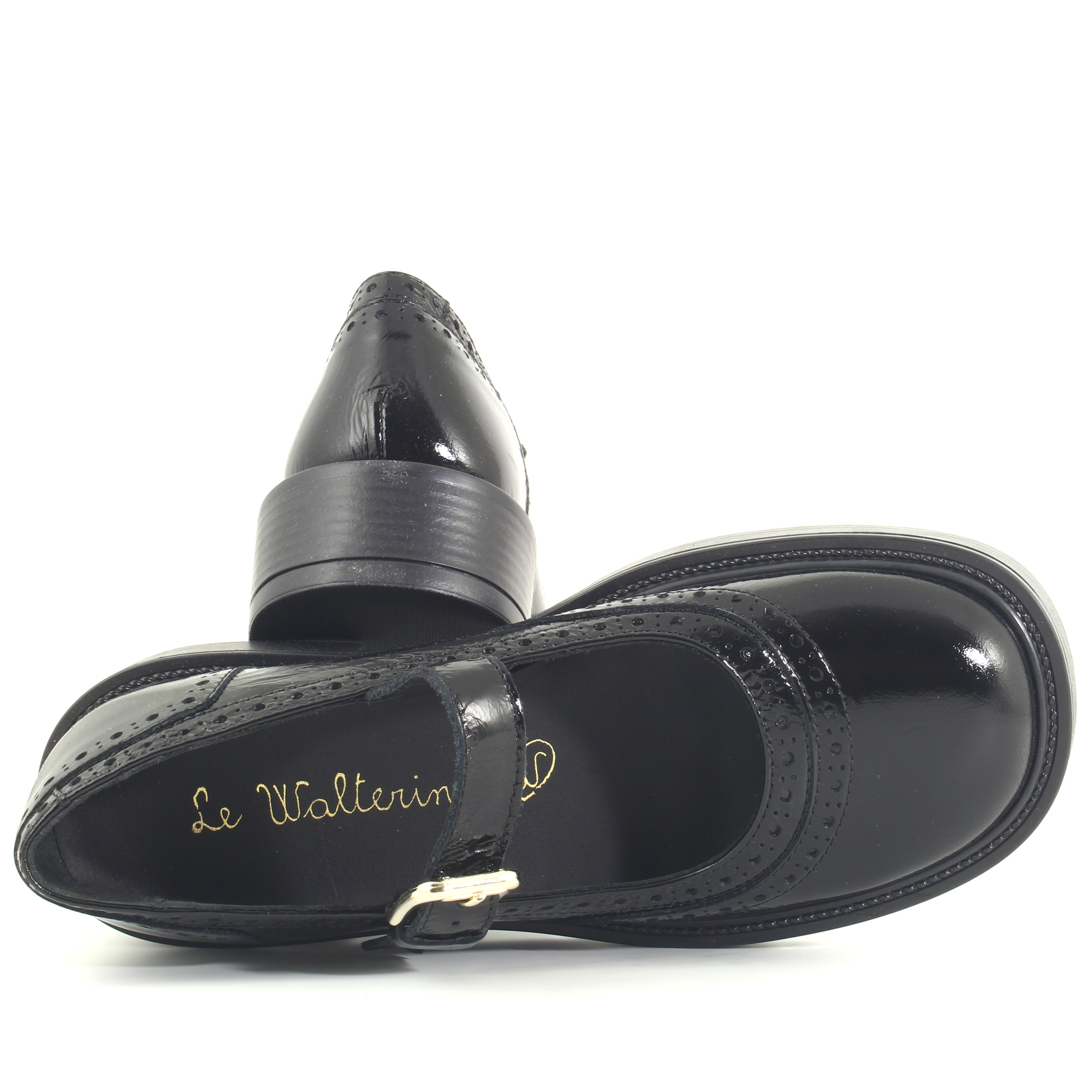 La ballerina Bristol con cinturino di Le Walterine in vernice nera ha un look senza tempo, con dettagli traforati che conferiscono un aspetto vintage. Il cinturino con fibbia dorata aggiunge un tocco chic, mentre il fondo in gomma la rende comoda e adatta anche a lunghe passeggiate.