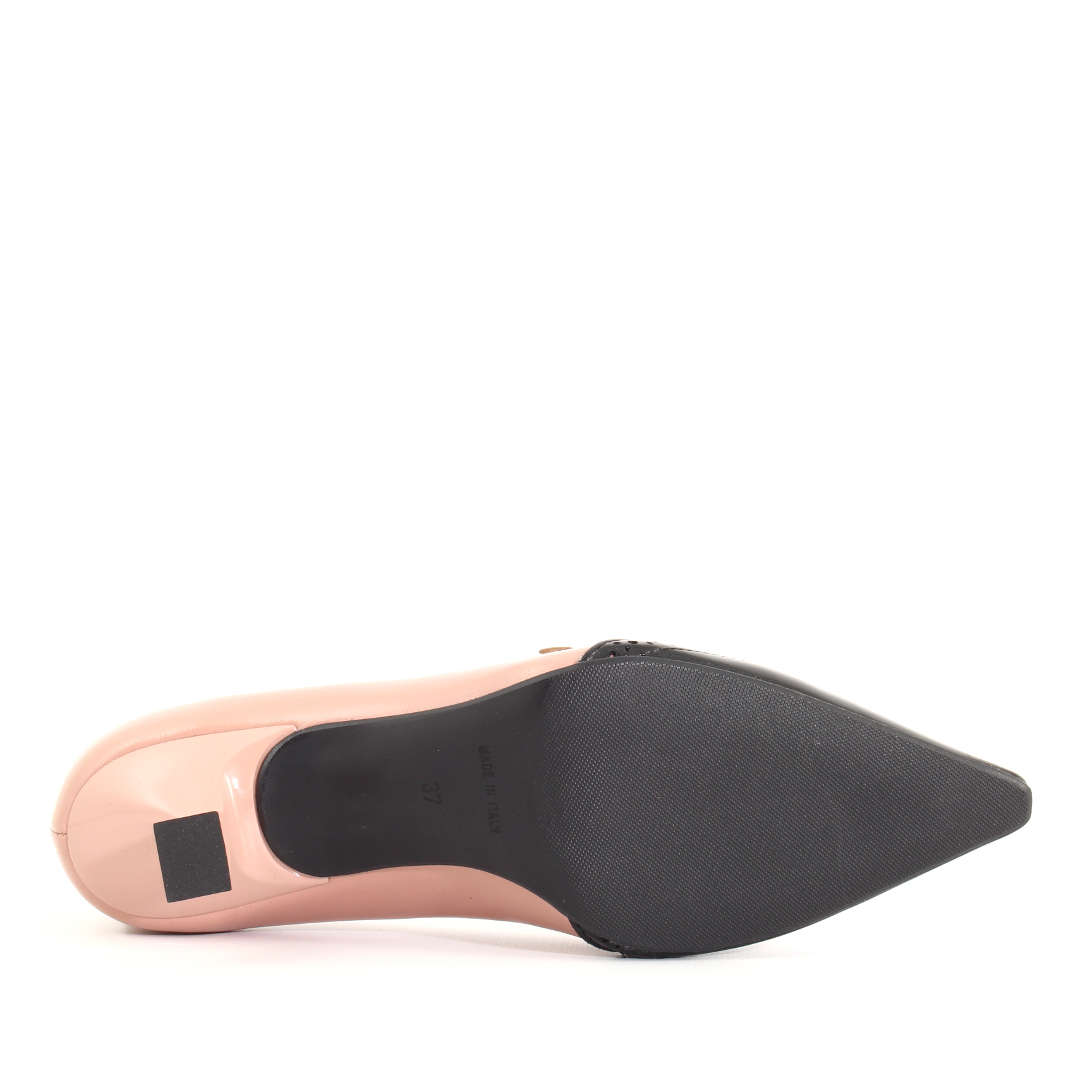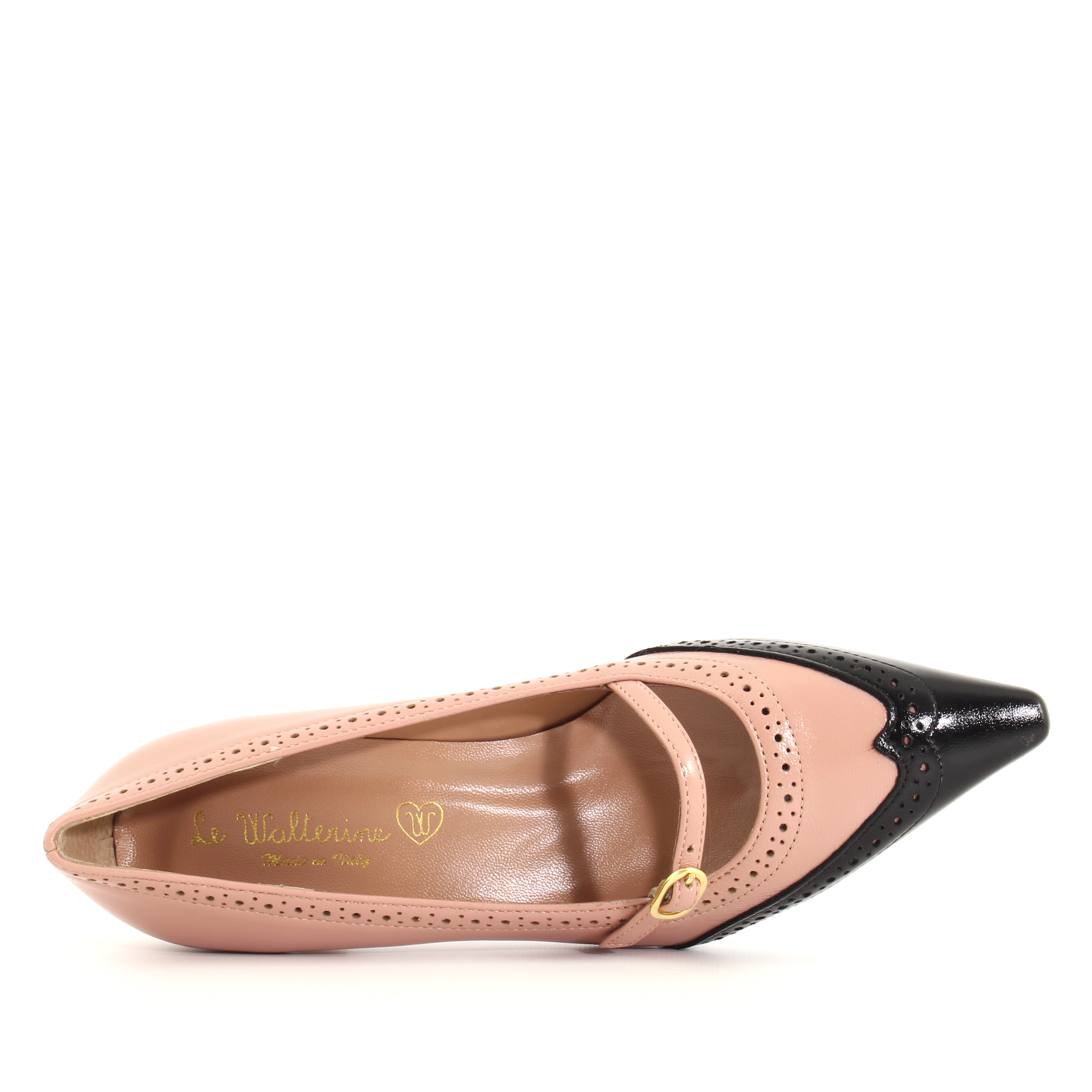 Ecco a te una décolleté super chic e piena di personalità! Questo piccolo gioiello di Le Walterine, con il suo tacco di 5 cm, è in vernice rosa e nera, con dettagli traforati e un elegante cinturino con fibbia dorata. Made in Italy, ovviamente – perché lo stile italiano si vede e si sente!
