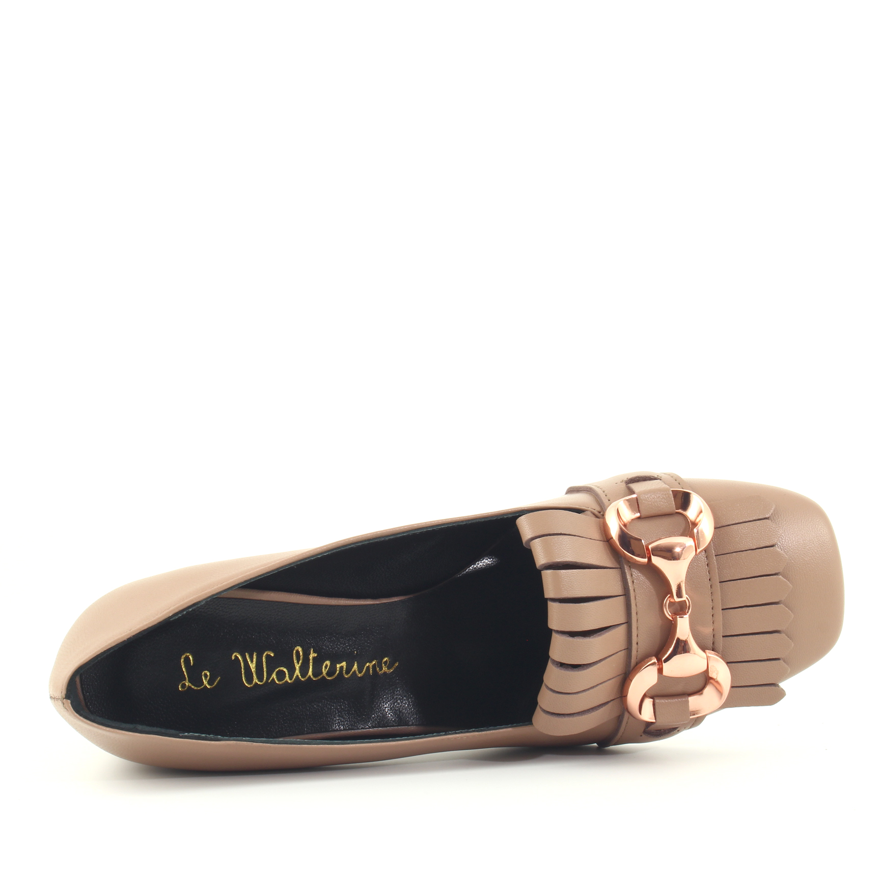 Mocassino donna con tacco 4 cm. Una scarpa elegante e comoda, ideale per chi cerca un po' di altezza senza sacrificare il comfort. L'applicazione dorata sulla tomaia aggiunge un elemento glamour al design della scarpa. Il mocassino Daria colore visone combina stile e comfort in modo sofisticato ed è perfetto per una varietà di occasioni eleganti. Realizzato artigianalmente in Italia.