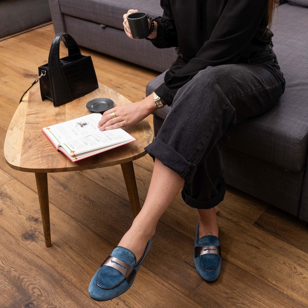 Mocassino Florentia, Le Walterine. Comodo mocassino donna in velluto silk con bocca di leone e bordino color canna di fucile. Questo mocassino penny loafer è disponibile in più varianti.