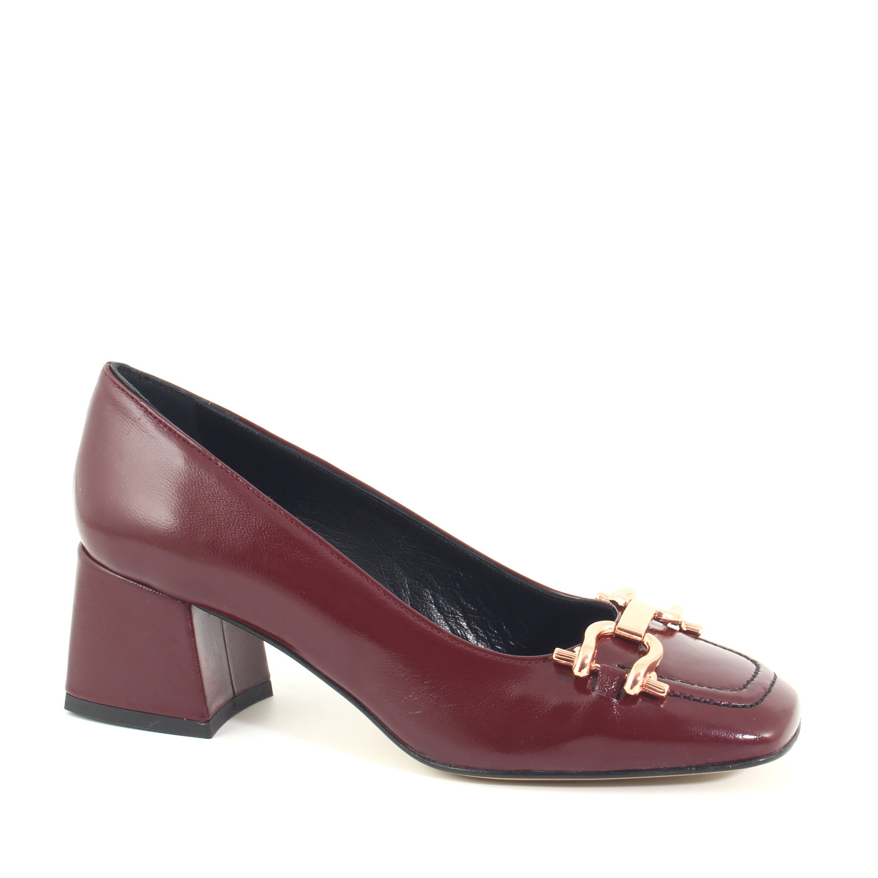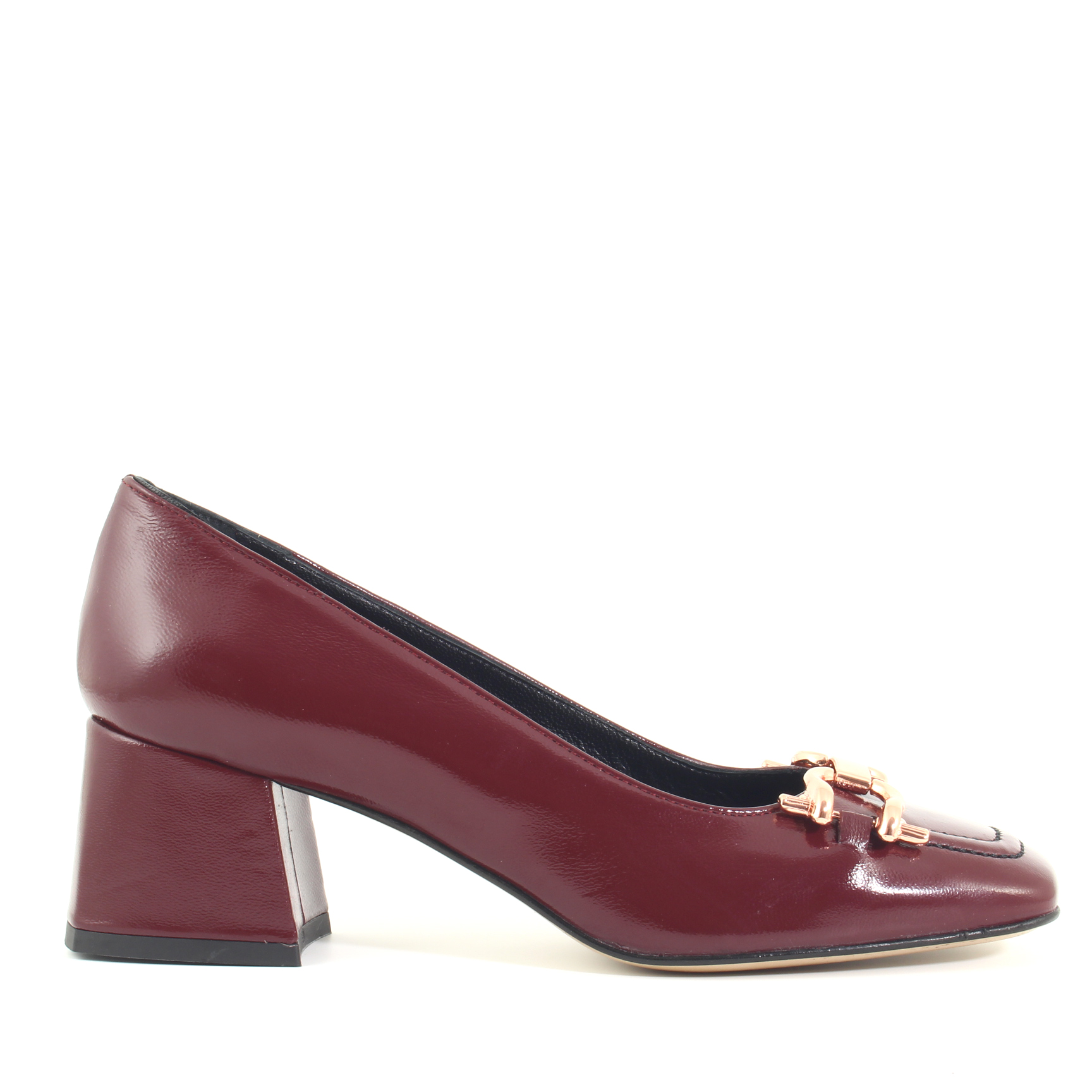 Mocassino donna in vernice con tacco 4 cm. Realizzato in pelle verniciata, questo mocassino presenta una suola piatta con un tacco largo che offre comfort e stabilità. L'applicazione sulla tomaia dona un tocco di raffinatezza al mocassino. Questo tipo di scarpa è ideale per occasioni formali o per un look da ufficio. Realizzato artigianalmente in Italia.