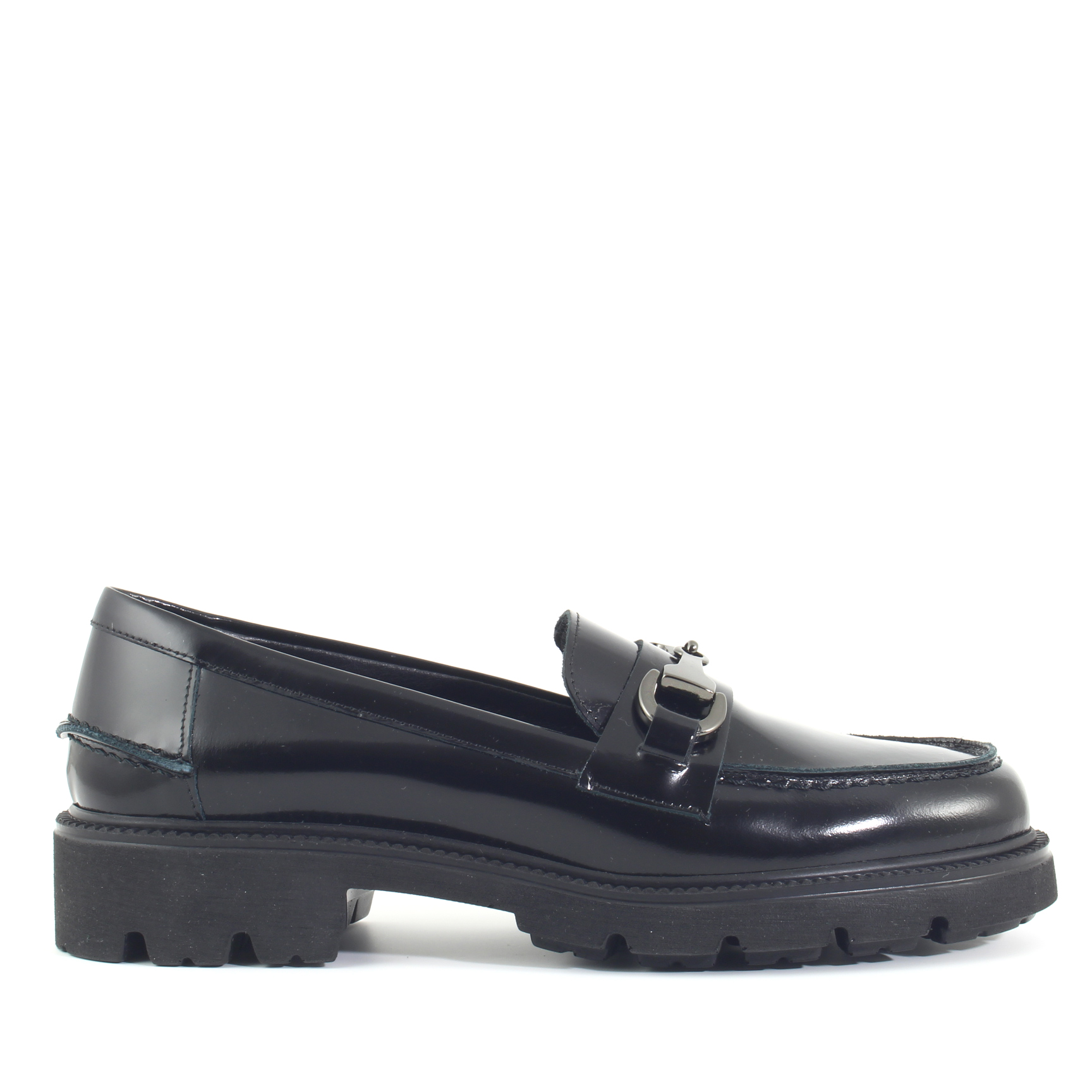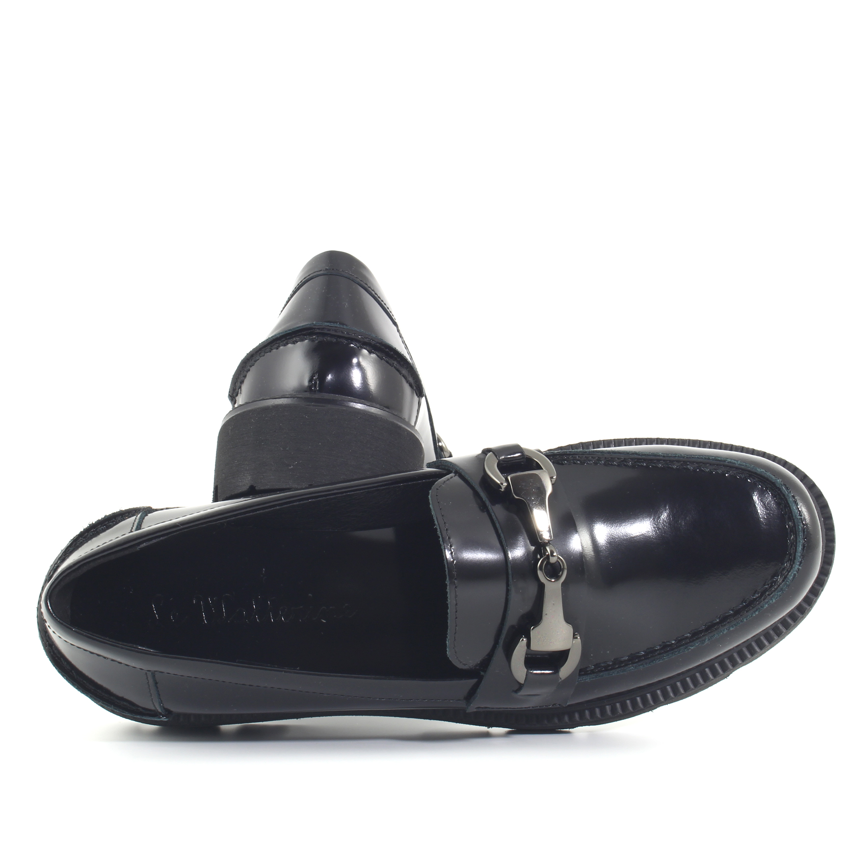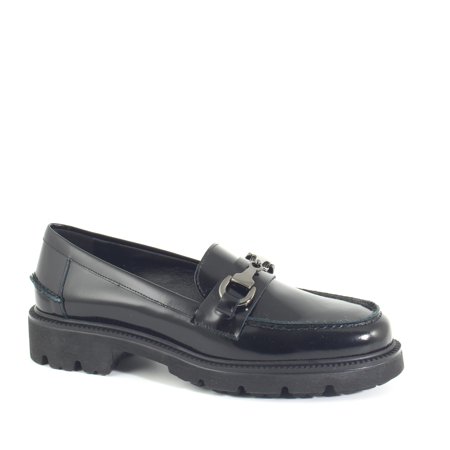 Il mocassino donna Jhonny in pelle con accessorio sulla tomaia e suola platform è una calzatura sofisticata e alla moda che combina il comfort di un mocassino con l'eleganza di un accessorio raffinato e una suola platform.