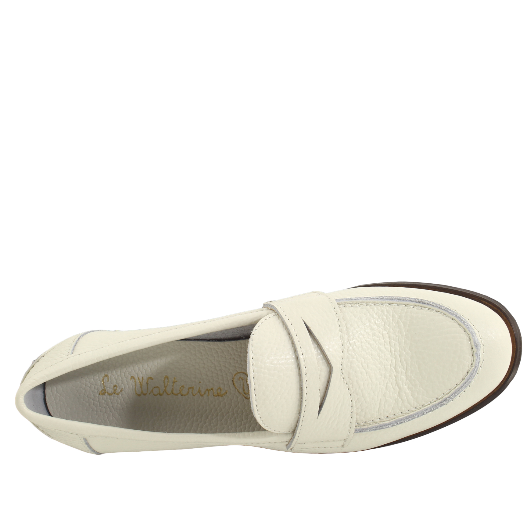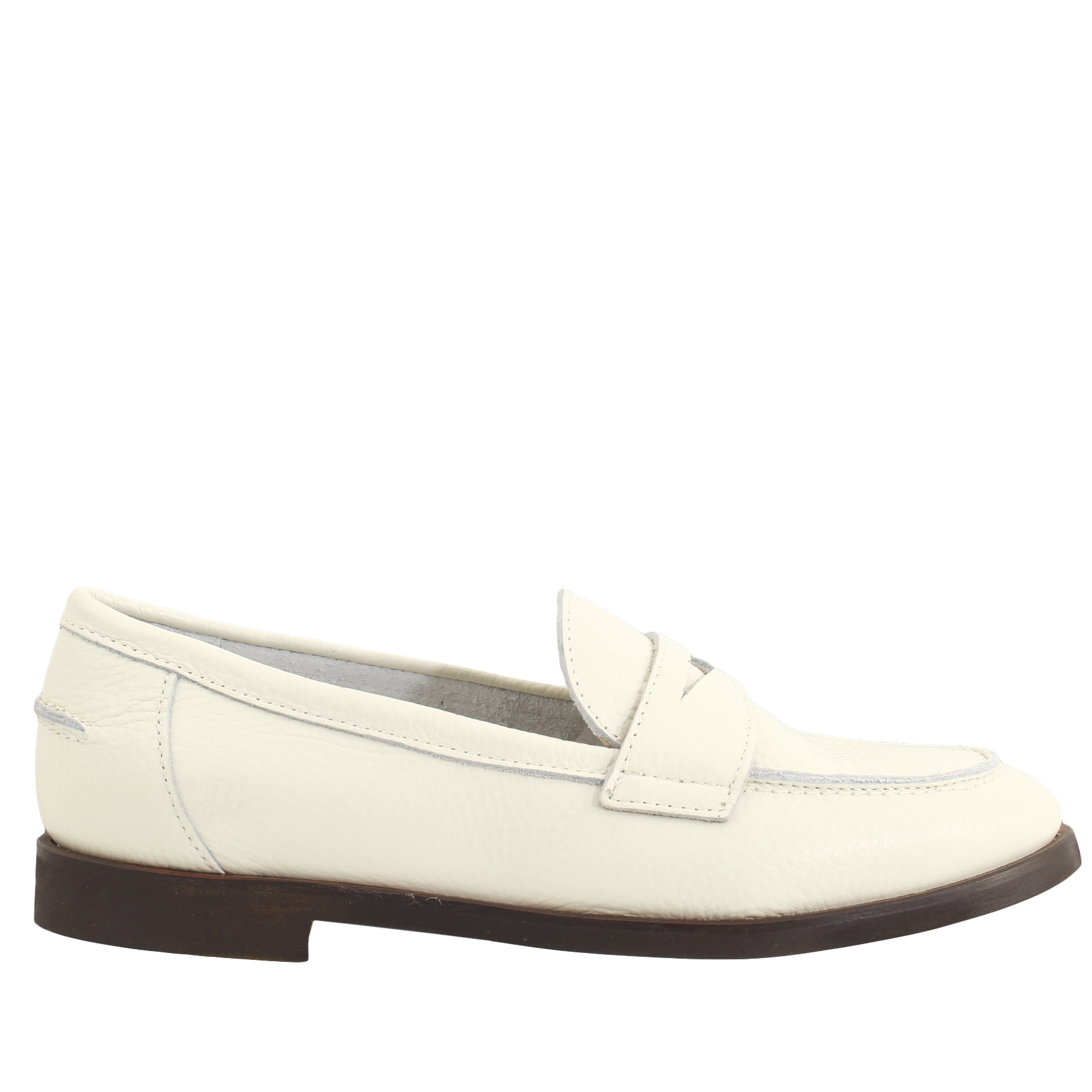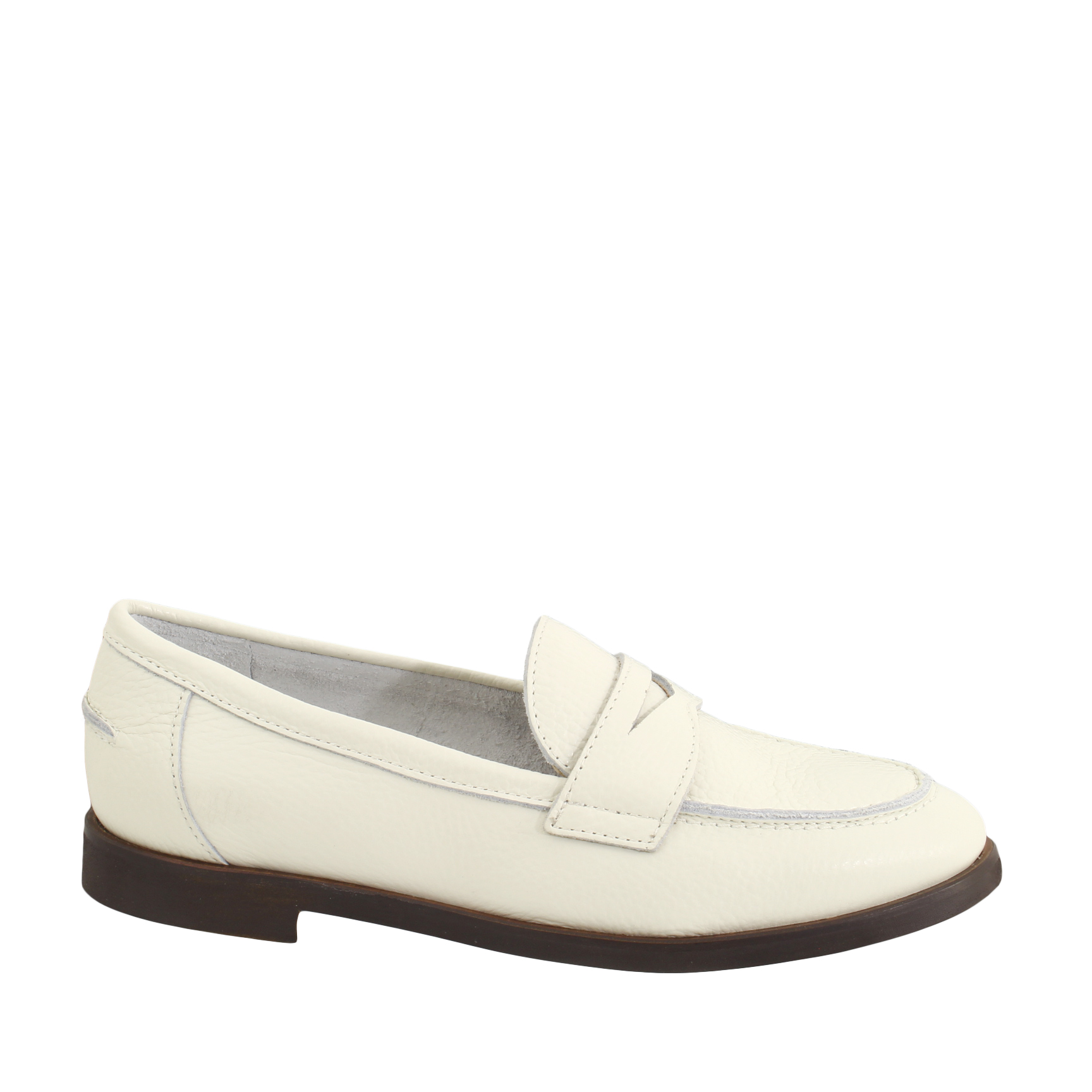 Mocassino penny loafer in pelle martellata di colore latte. Una scarpa elegante e versatile, che combina il comfort classico del mocassino con un'estetica sofisticata. La pelle martellata, nota per la sua superficie leggermente ruvida e resistente, offre un aspetto di qualità e durata, mentre la colorazione in tonalità latte aggiunge un tocco di raffinatezza e delicatezza.