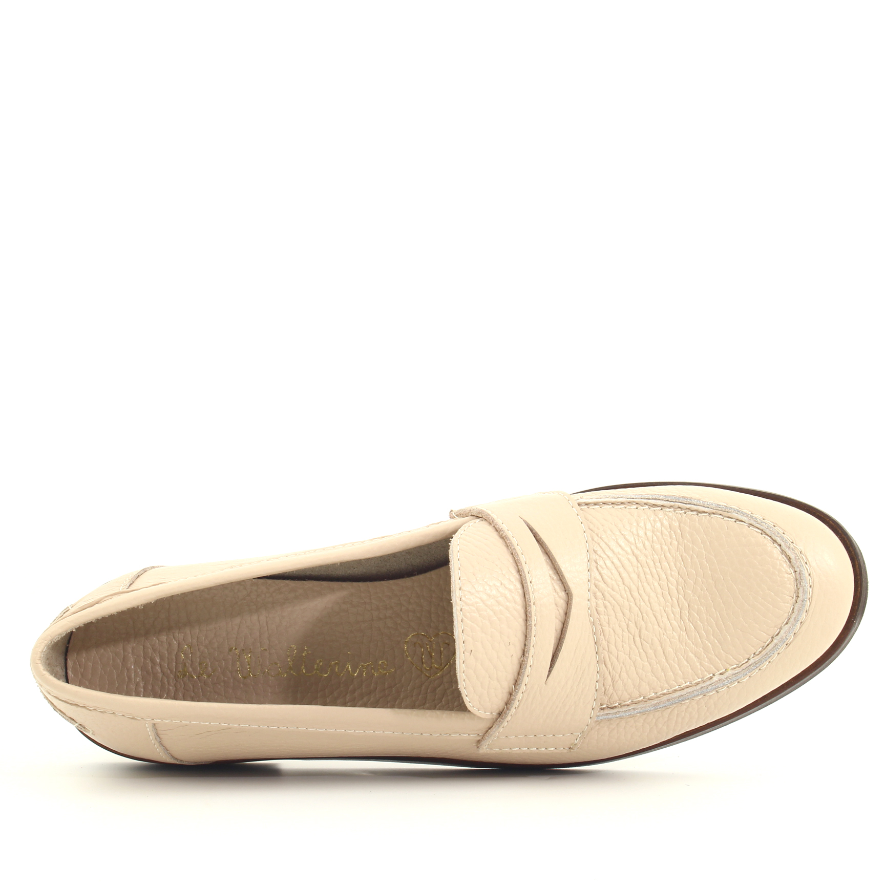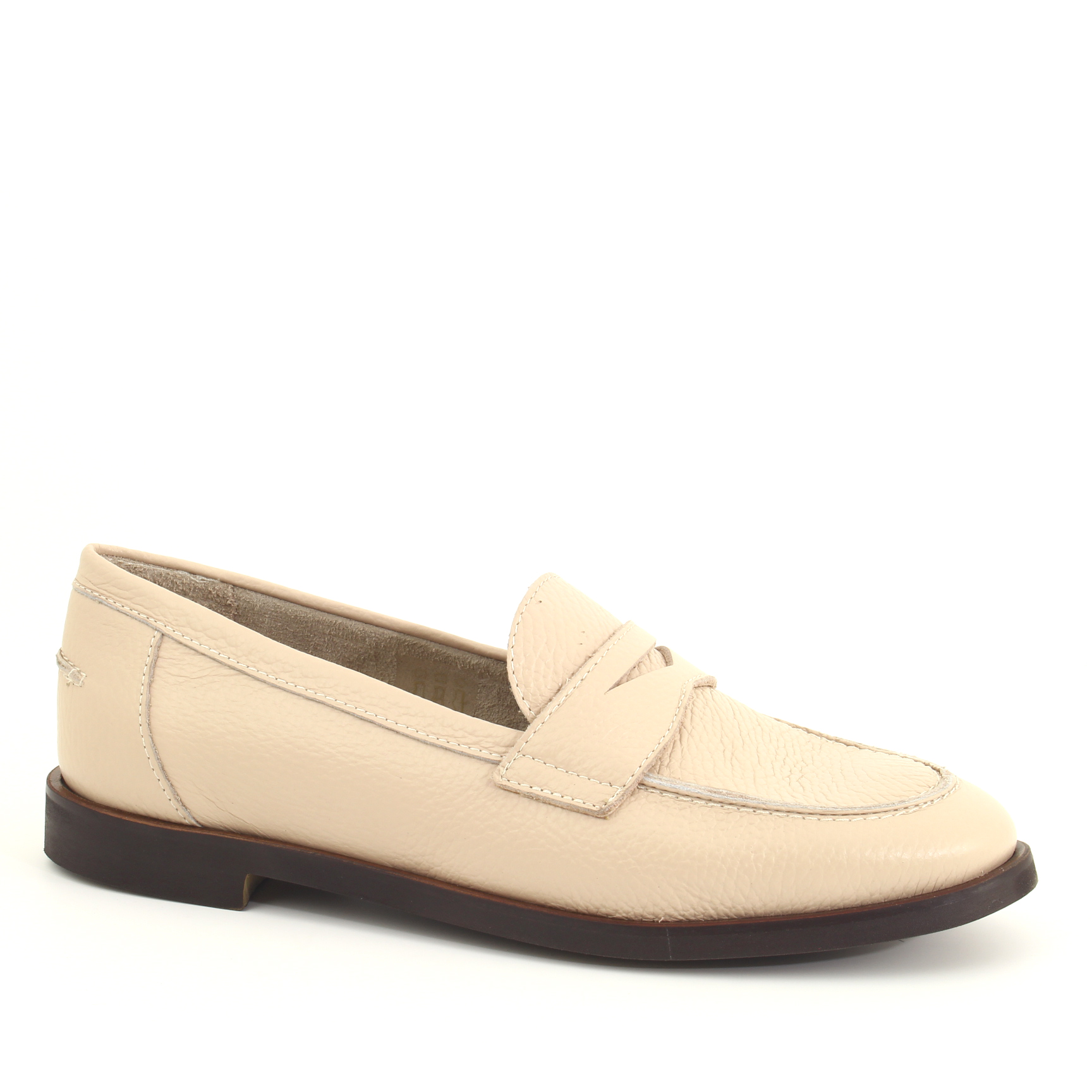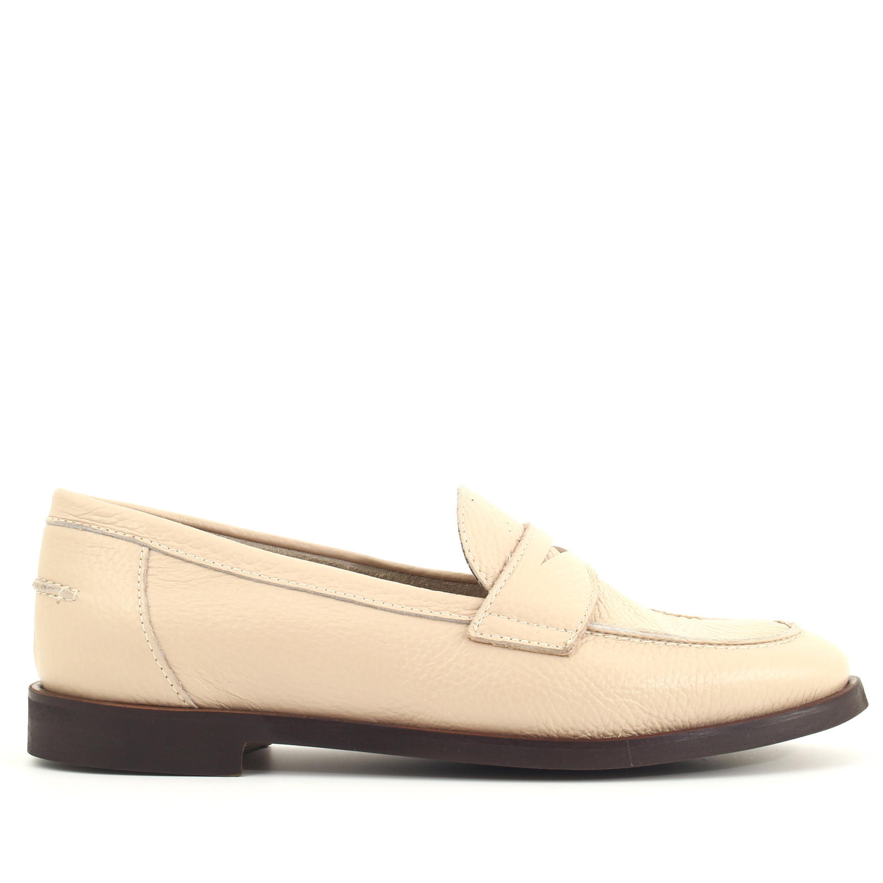 Mocassino penny loafer da donna in pelle martellata di colore rosa, una scarpa elegante e delicata, perfetta per aggiungere un tocco di femminilità a qualsiasi outfit. La pelle martellata, con la sua caratteristica texture leggermente ruvida e granulosa, conferisce alla scarpa un aspetto di qualità e resistenza, pur mantenendo una certa raffinatezza.