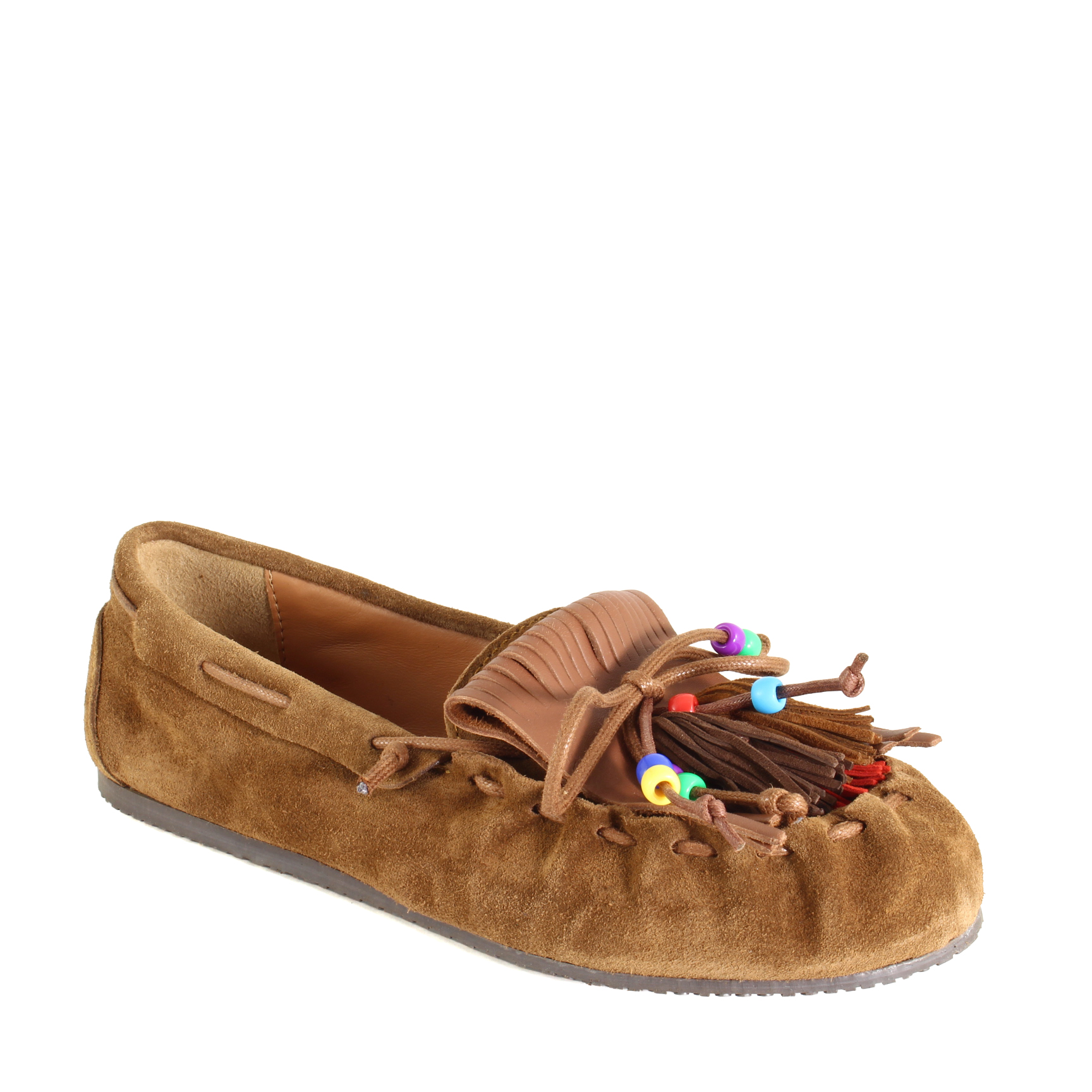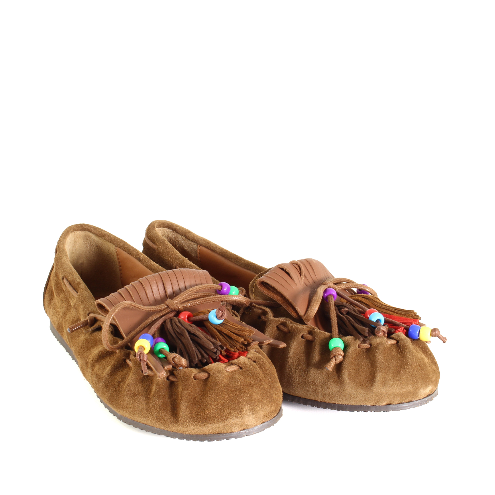 La frangia tono su tono cuoio mantiene un’estetica coerente e materica, valorizzando la naturalezza del modello senza contrasti, ma con una ricchezza di texture che emerge nei dettagli. Le piccole perline applicate aggiungono un accento discreto e artigianale, come piccoli riflessi che catturano la luce tra una vetrina e l’altra.