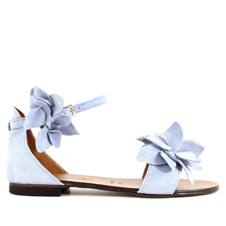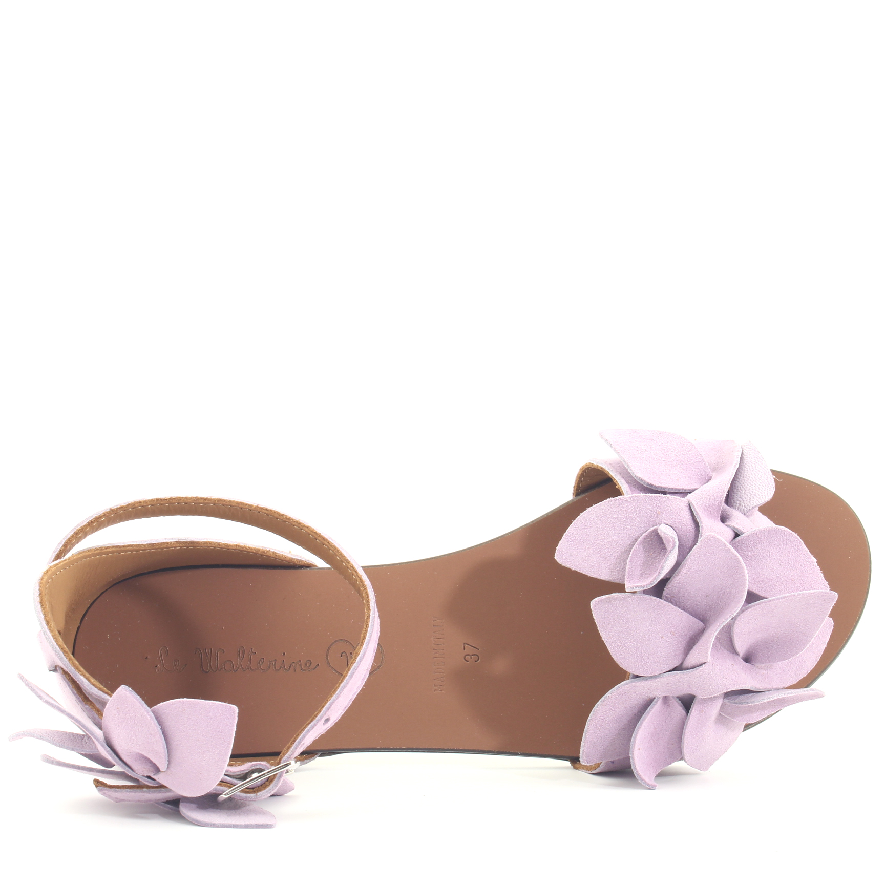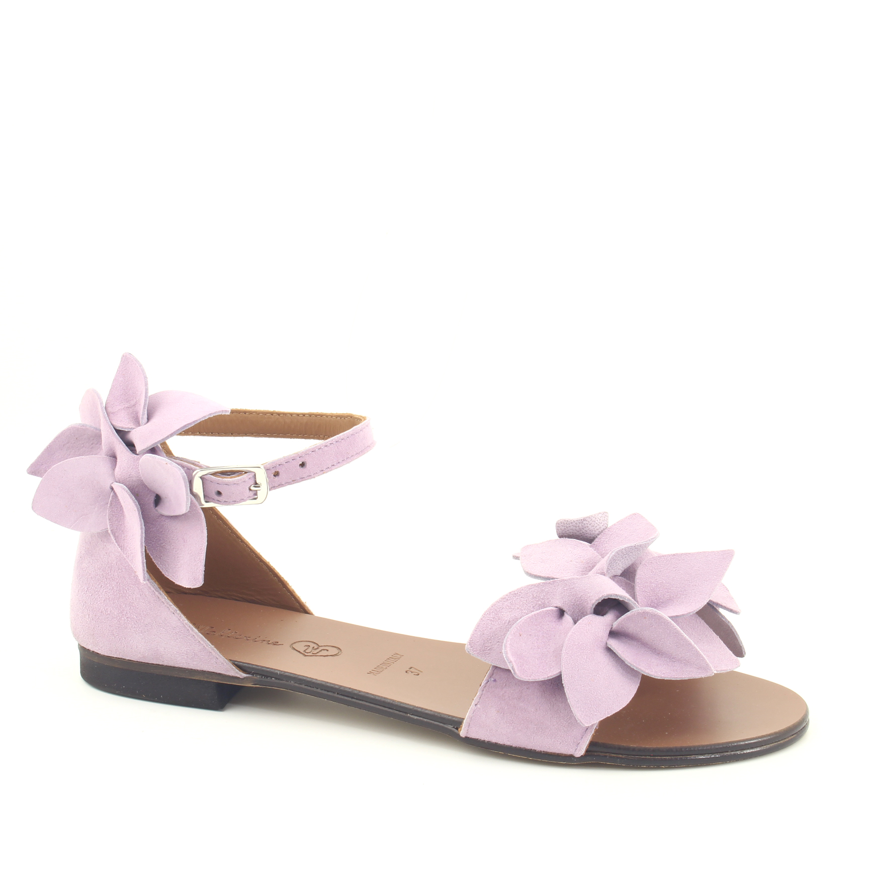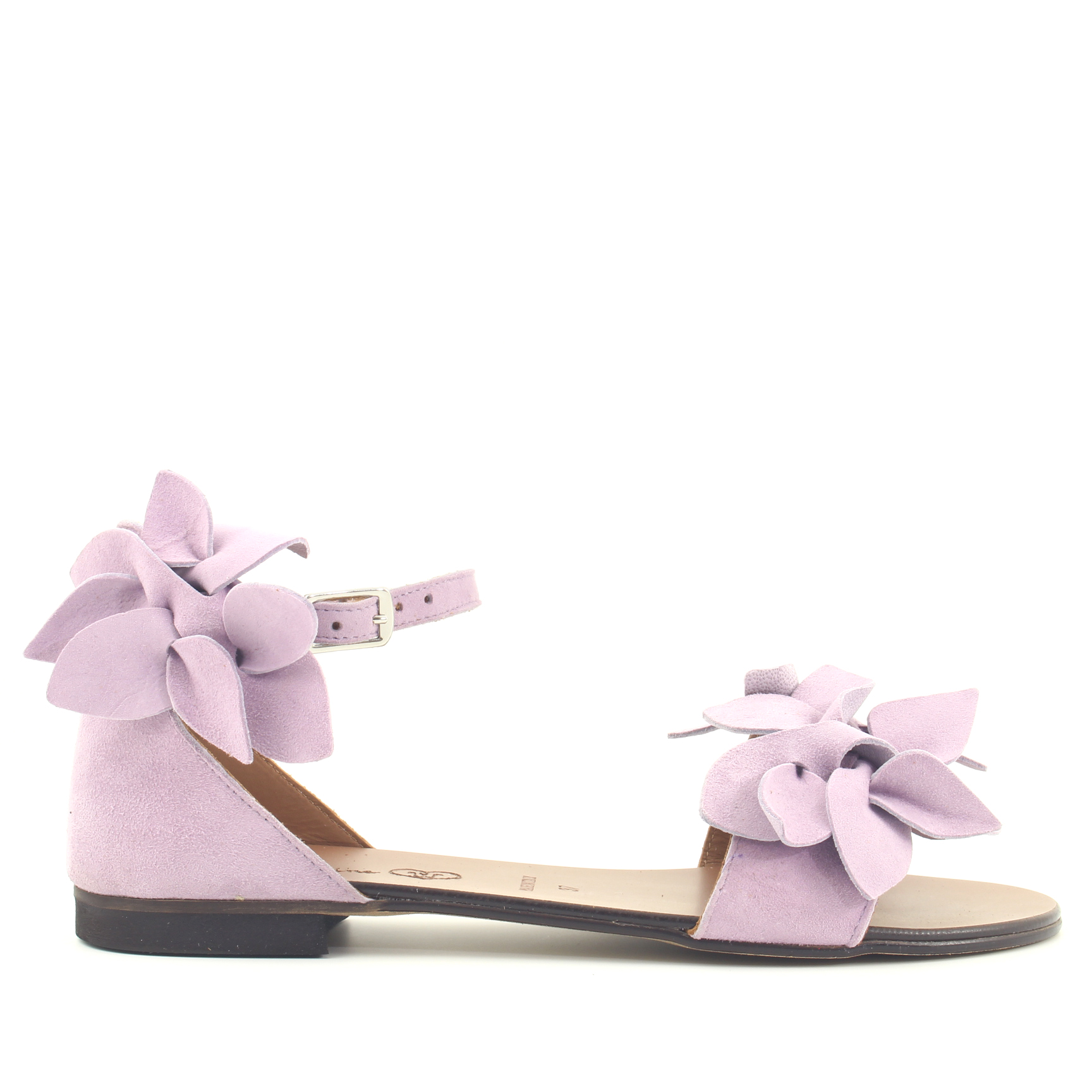 Sandalo flat donna con tomaia in pelle o camoscio e suola in gomma. Fascia principale con petali stile fiore. Il fiore più piccole applicato sul cinturino è removibile.