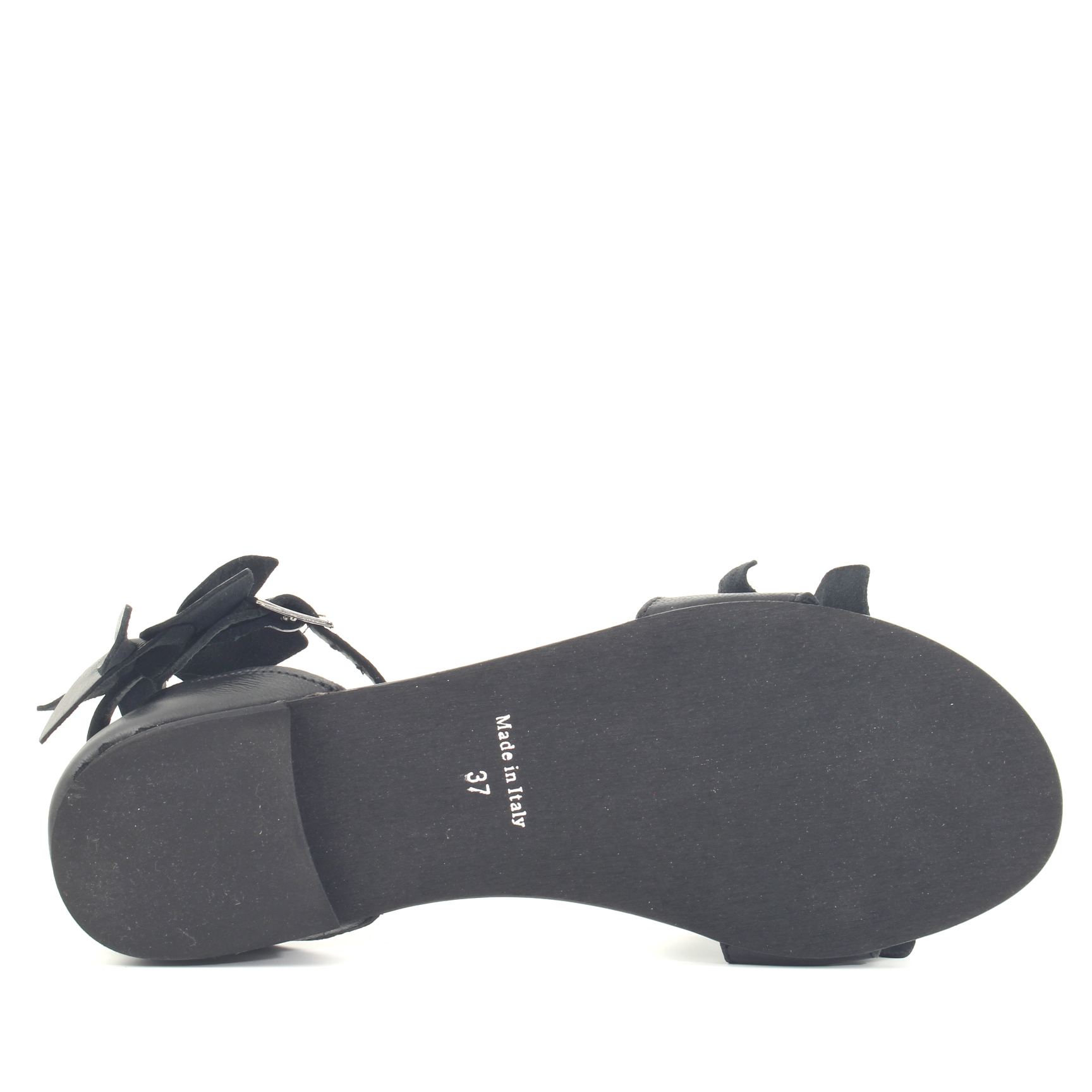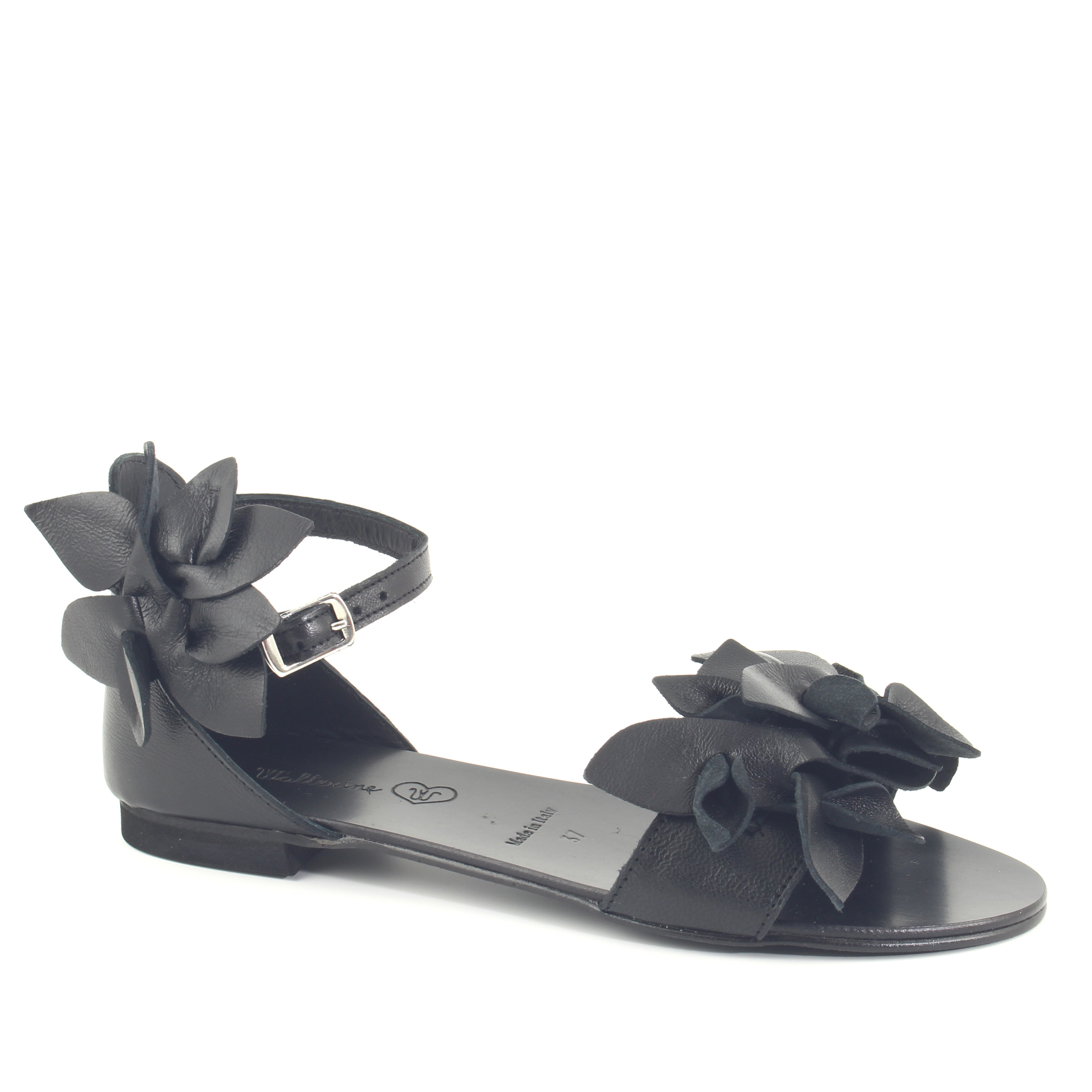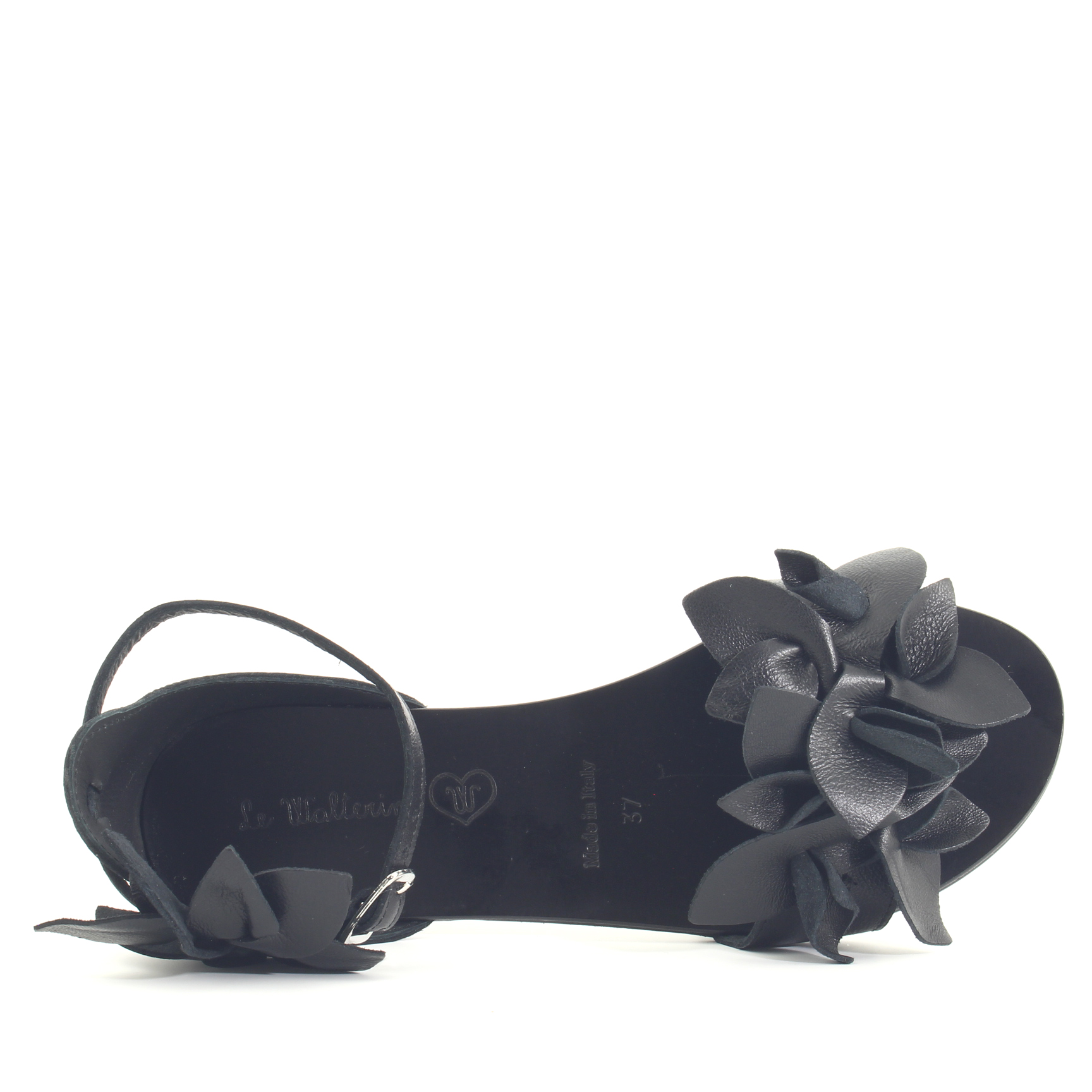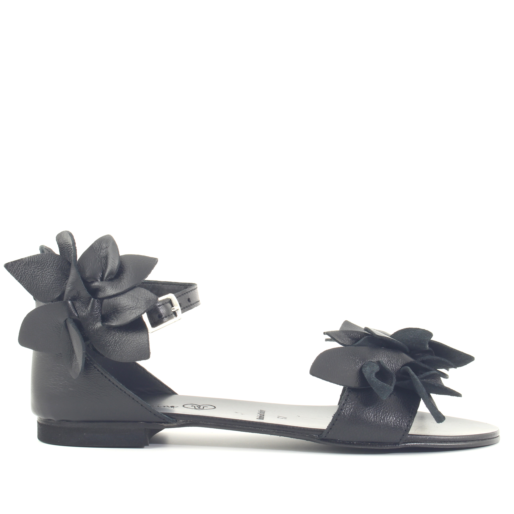 Sandalo flat donna con tomaia in pelle colore nero e suola in gomma. Fascia principale con petali stile fiore. Il fiore più piccolo applicato sul cinturino è removibile. Made in Italy.