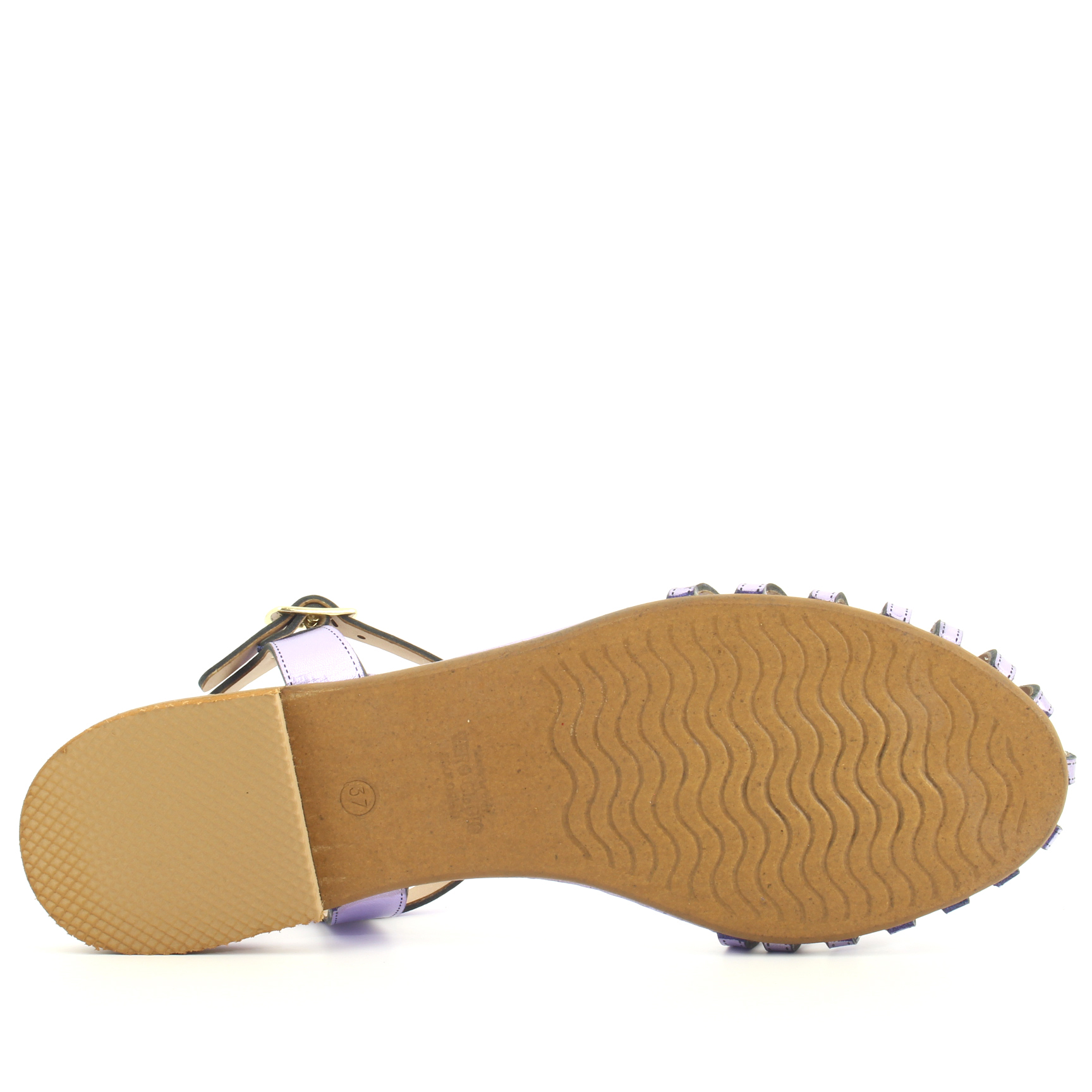 Sandali in laminato con tomaia a gabbietta, suola in cuoio e sottopiede imbottito.