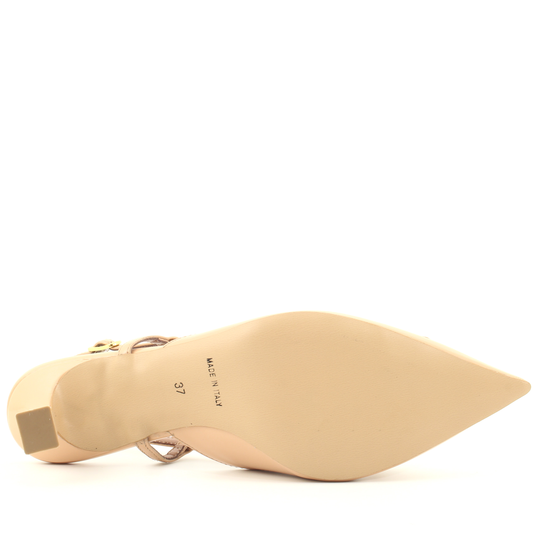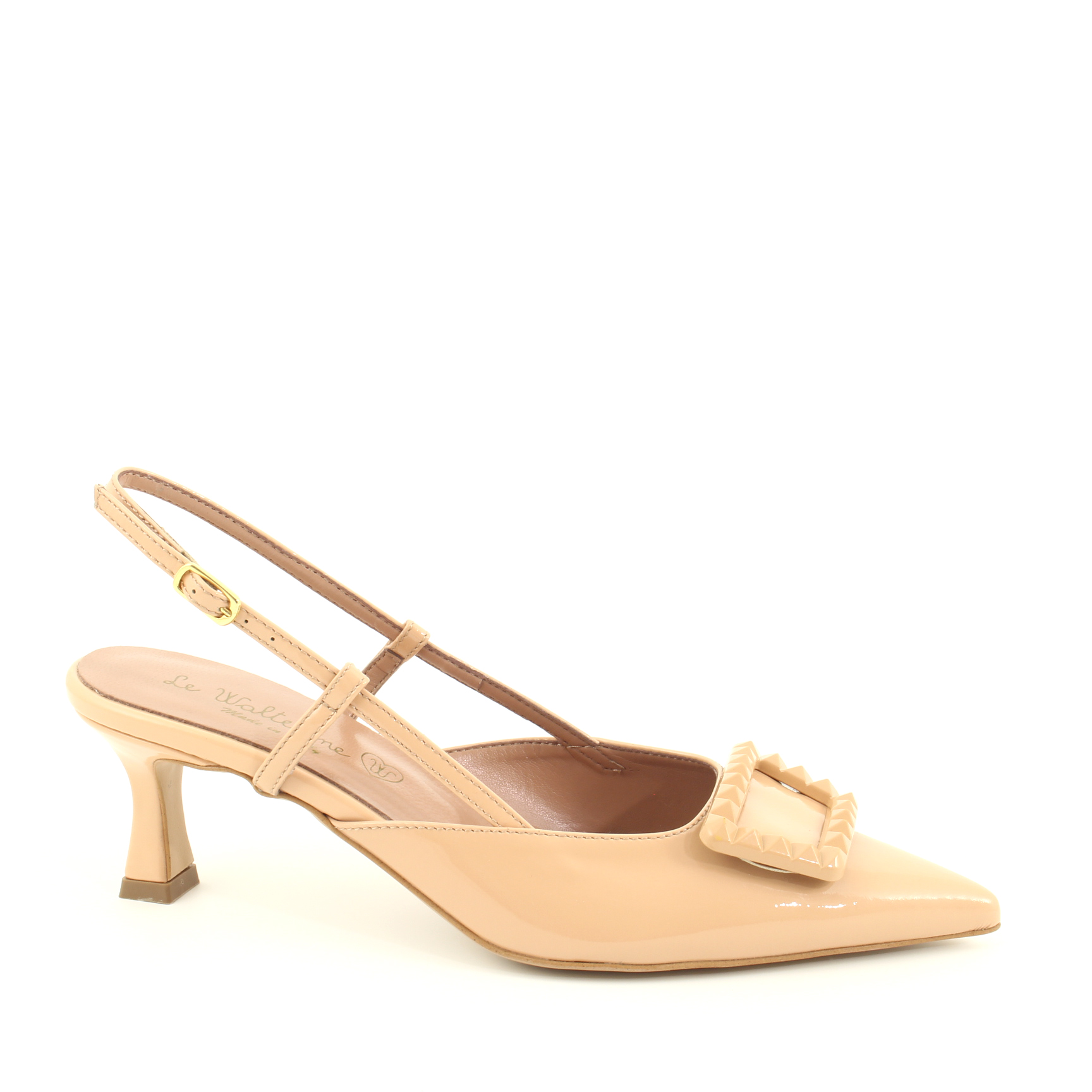 Slingback in vernice a punta, tacco 5 cm con accessorio applicato alla tomaia. L'accessorio è in tinta. Le pipette che reggono il cinturino unite alla regolazione tramite la fibbia assicurano una calzata stabile e una camminata sicura. Disponibile in tre versioni colore tutte da scegliere. Una slingback originale e femminile per i tuoi outfit estivi!