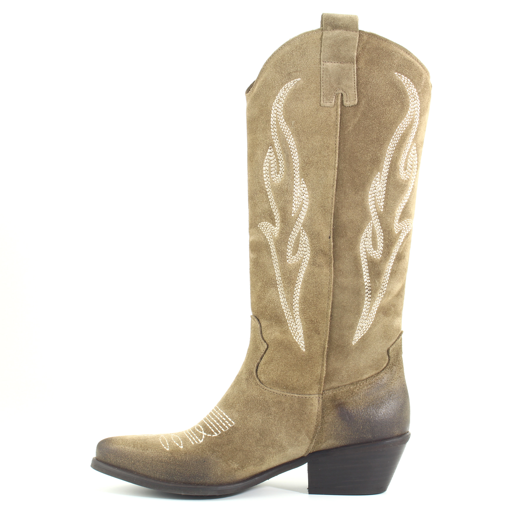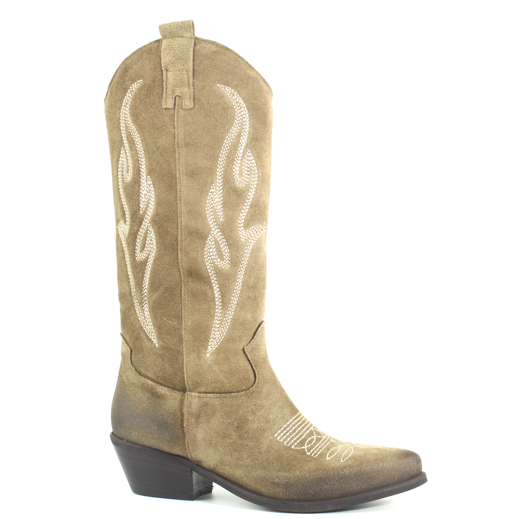 Stivale texano donna scamosciato con ricami, fondo gomma. Lo stivale texano è un vero must-have di questo 2023! Perfetto anche per la stagione estiva, indossato con gamba nuda sotto una gonna mini o sotto uno chemisier fiorato. Il tirante tipico dello stivale texano agevola la calzata. Il tacco 5 cm lo rende comodo ed estremamente versatile. Realizzato artigianalmente in Italia.