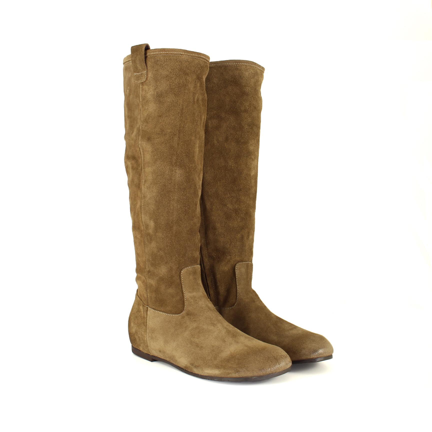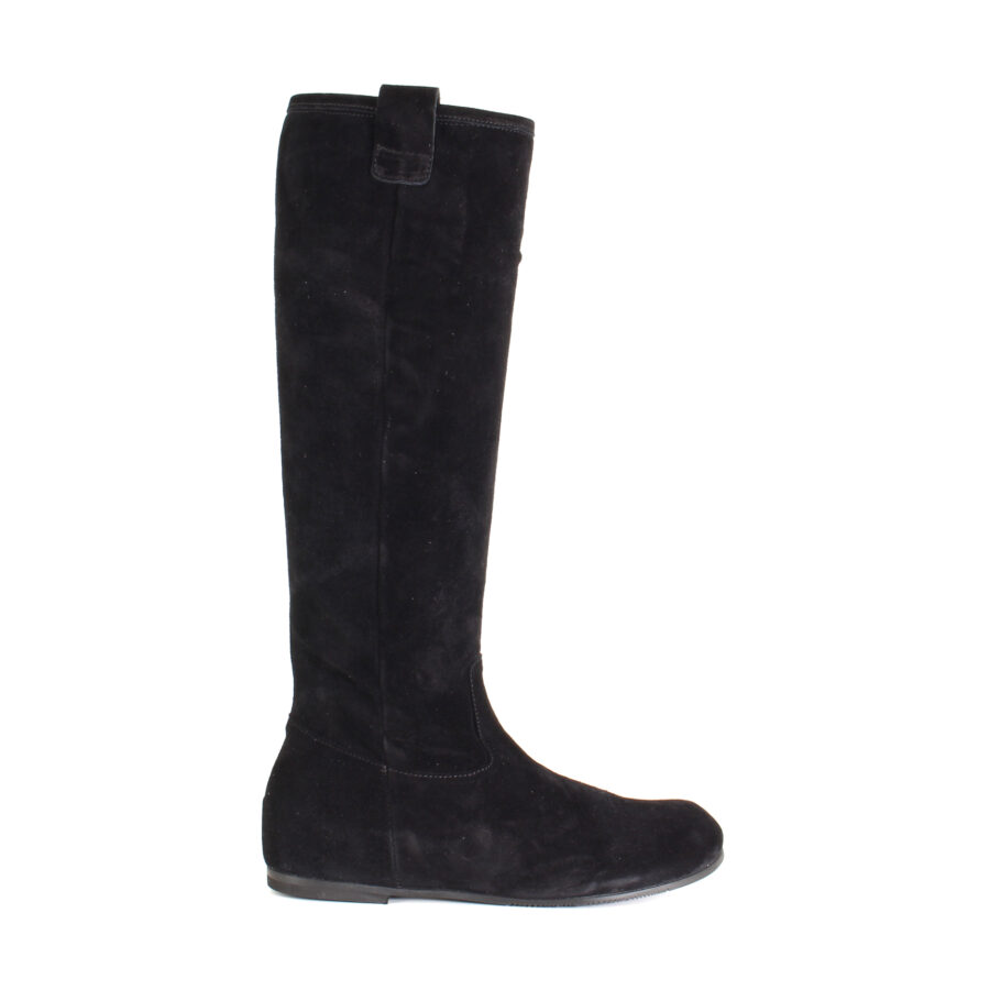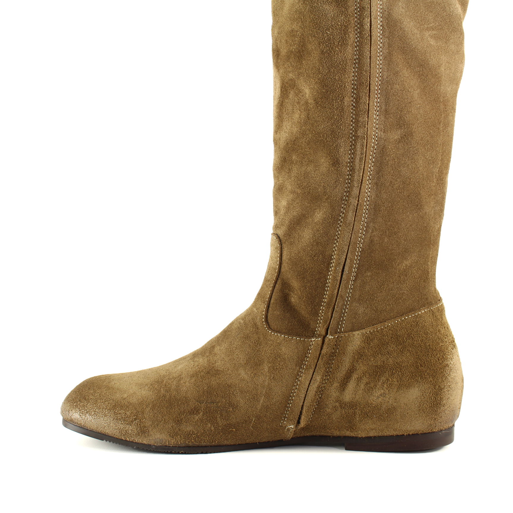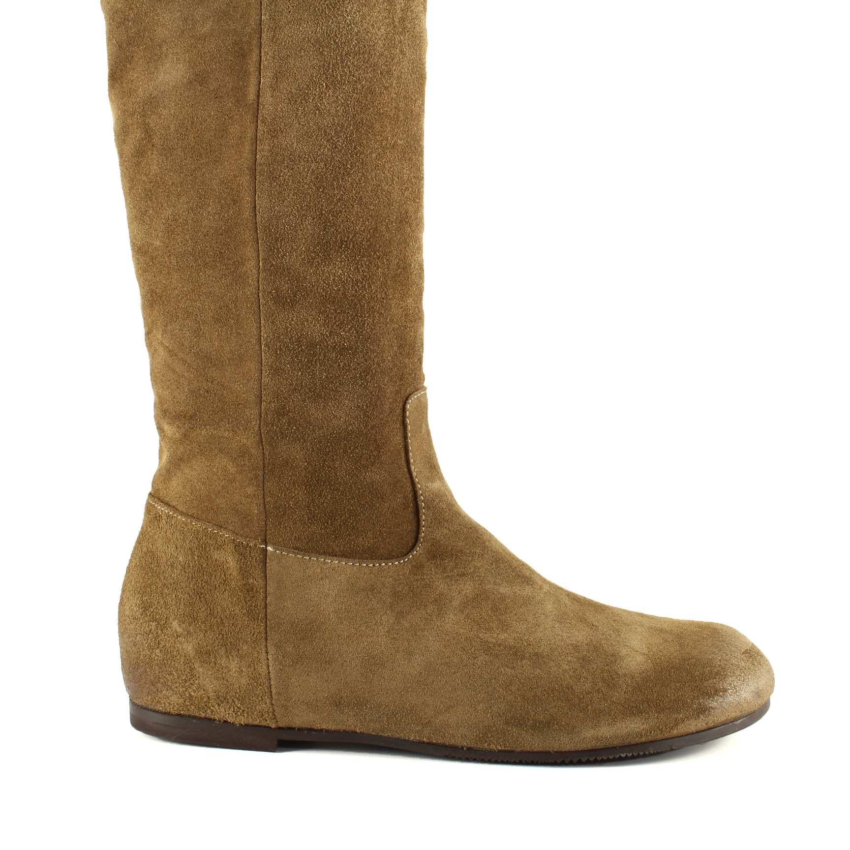 La pelle scamosciata color cuoio, calda e morbida, avvolge la gamba con naturalezza, mentre la punta arrotondata e il tacco basso da 1 cm garantiscono comfort e sobrietà. La cerniera laterale aggiunge praticità senza rinunciare al tocco raffinato — uno stivale che accompagna la quotidianità con grazia discreta e stile autentico.