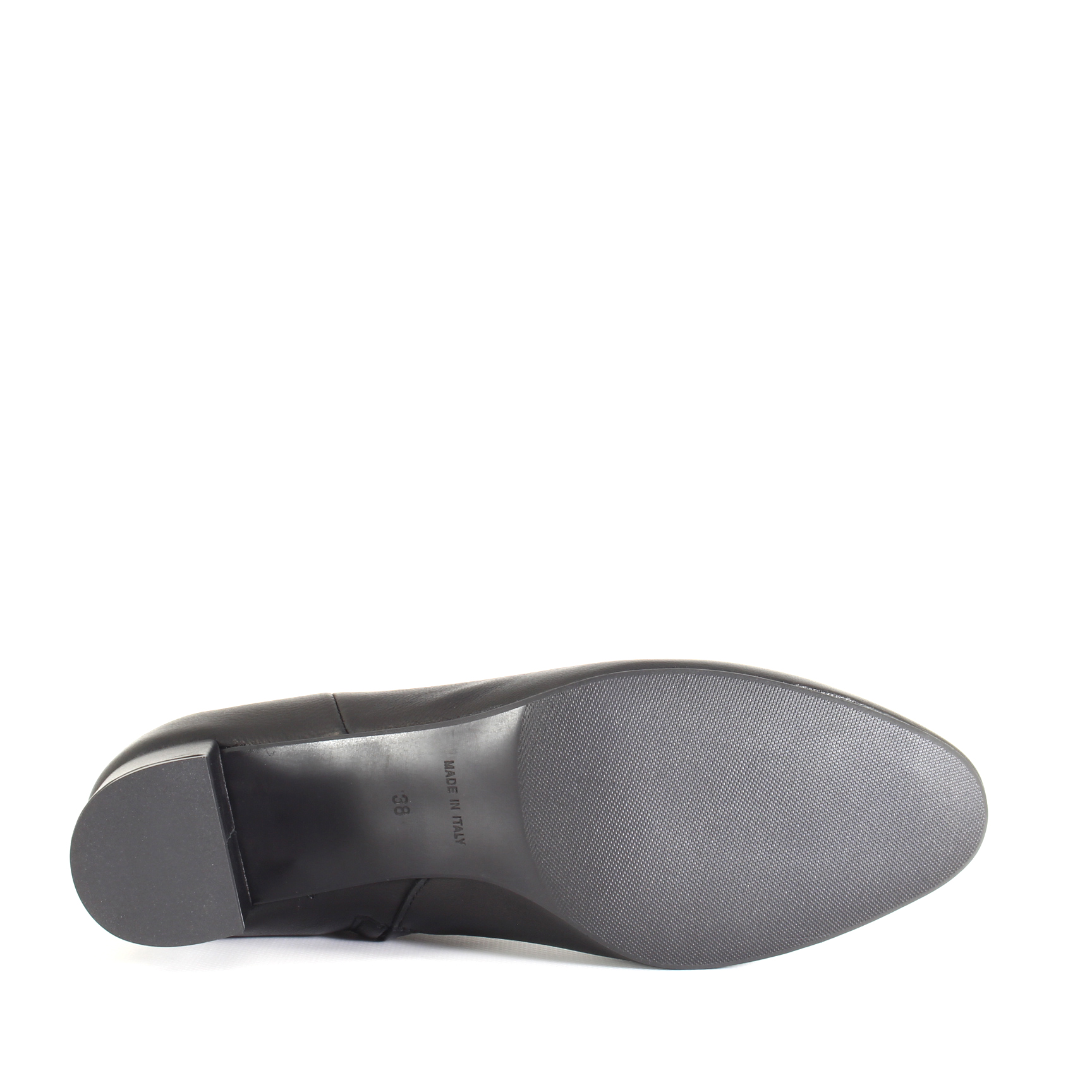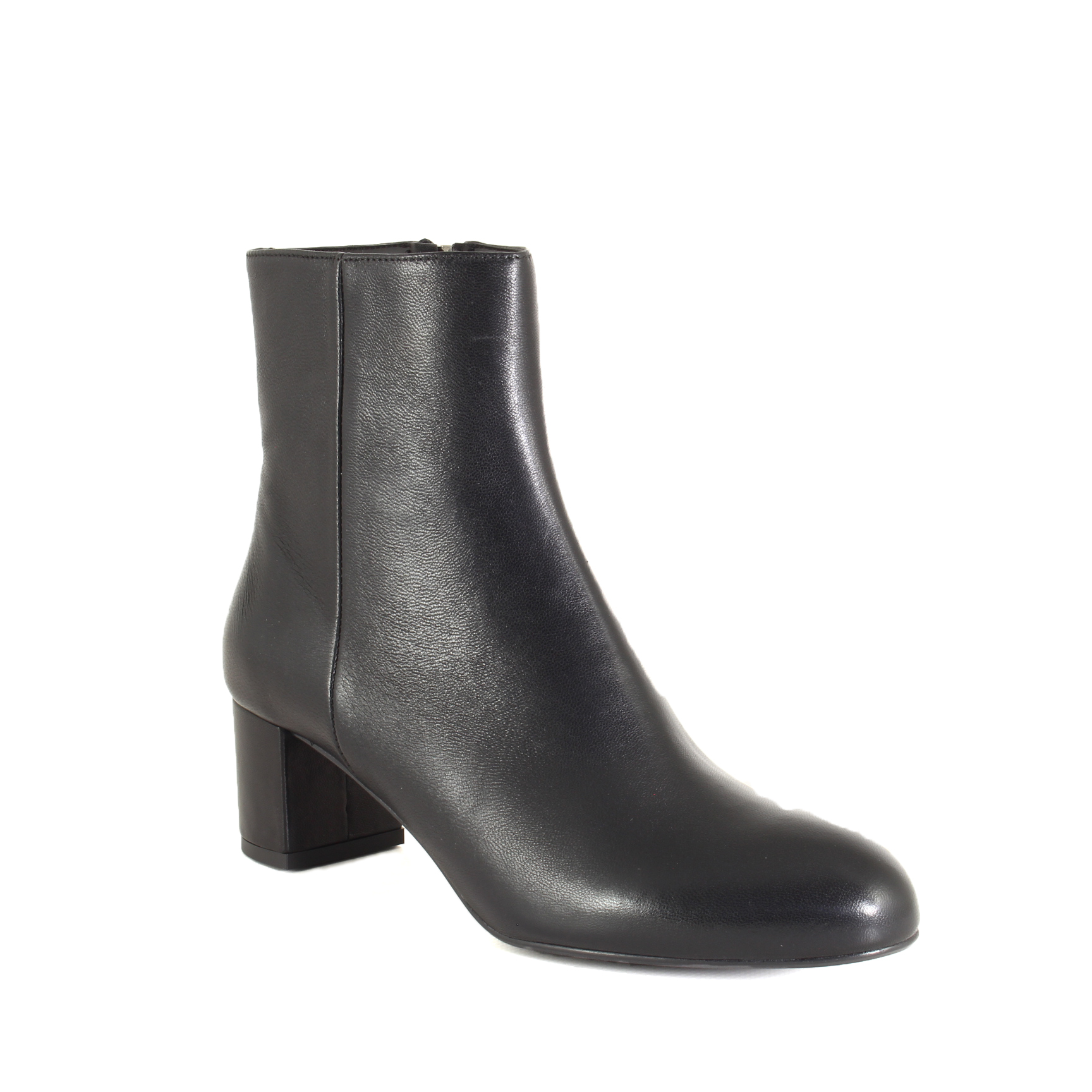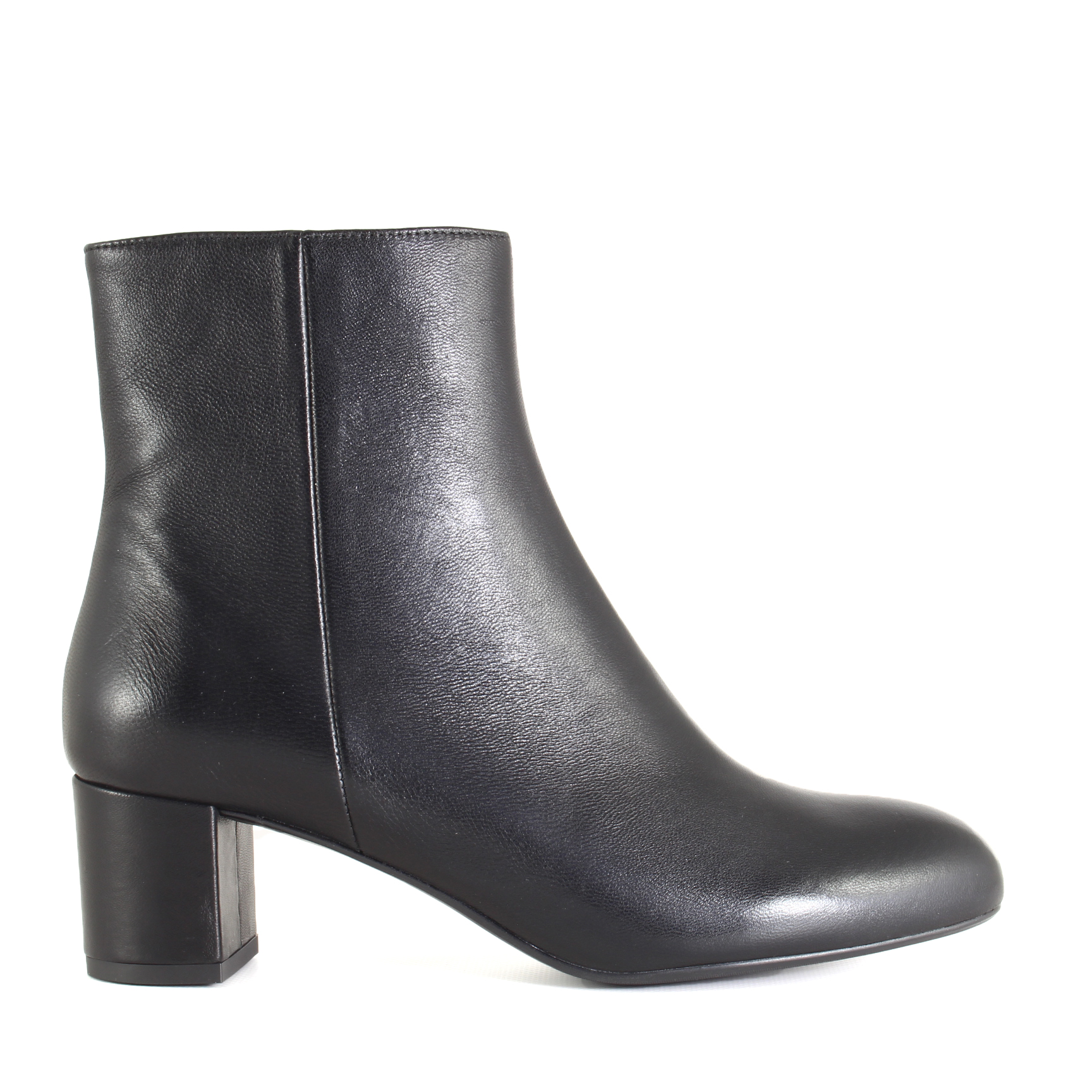 La pelle nera, morbida e strutturata, avvolge il piede con naturale eleganza, mentre la cerniera laterale rende la calzata pratica e immediata. Il tacco largo da 5 cm è il giusto equilibrio tra comodità e raffinatezza: slancia senza chiedere sforzo, sostiene senza mai farsi sentire.