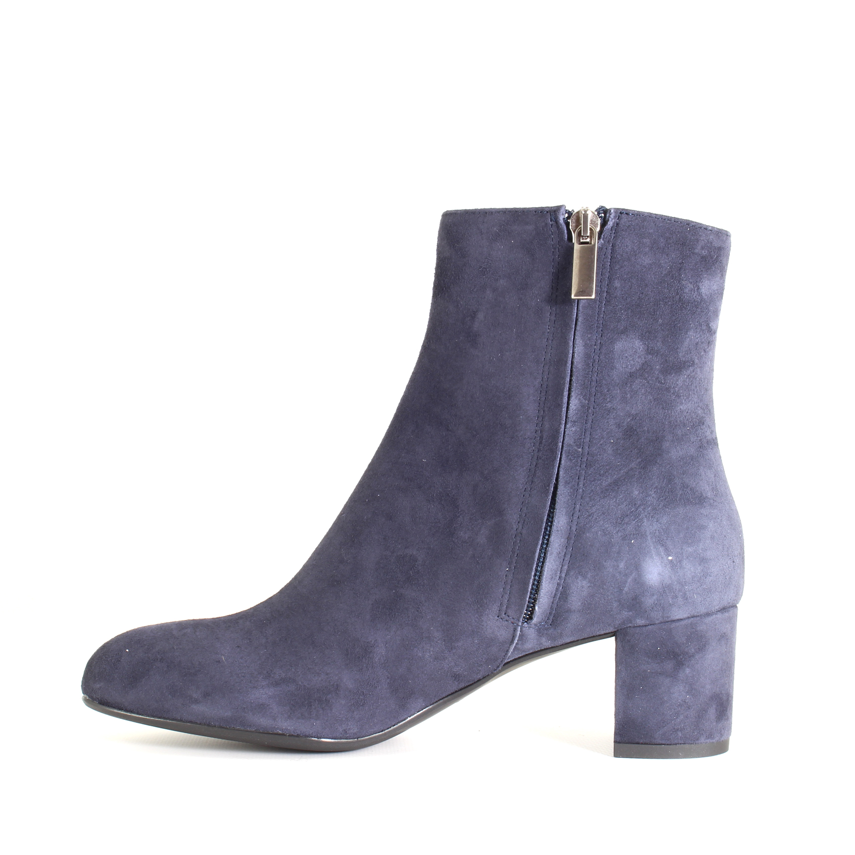 La pelle scamosciata blu, morbida e vellutata, dona al modello un carattere sofisticato ma quotidiano, mentre la cerniera laterale garantisce una calzata pratica e rapida. Il tacco largo da 5 cm offre un equilibrio perfetto tra comfort e femminilità, pensato per accompagnarti dalla mattina alla sera con la stessa naturalezza.