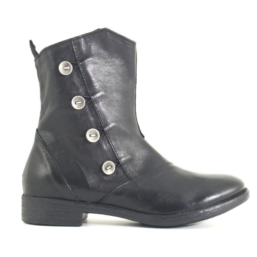 Lo stivaletto Elaine di Le Walterine in pelle nera con bottoni laterali è come la versione calzaturiera di una giacca militare chic: ha carattere, è deciso e quei bottoni laterali in argento gli danno un'aria da "sono qui per dominare le strade con stile"! È uno di quegli stivaletti che urla "portami ovunque", dal brunch alla passeggiata in centro, con quella giusta dose di rock 'n' roll data dai dettagli metallici, ma sempre con un tocco di eleganza senza sforzo.