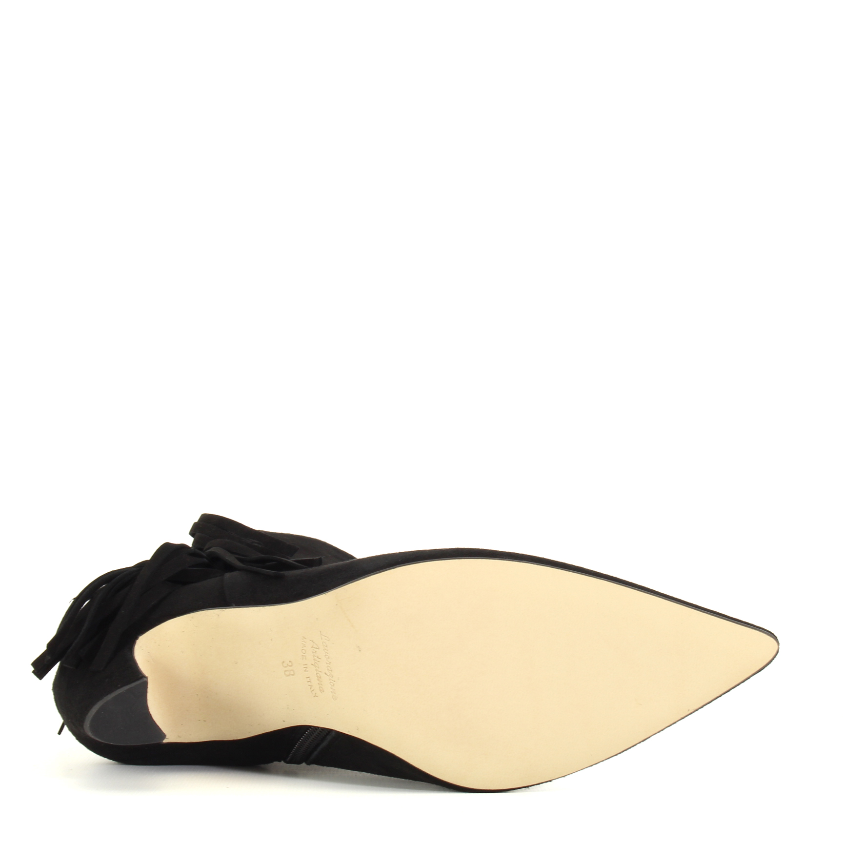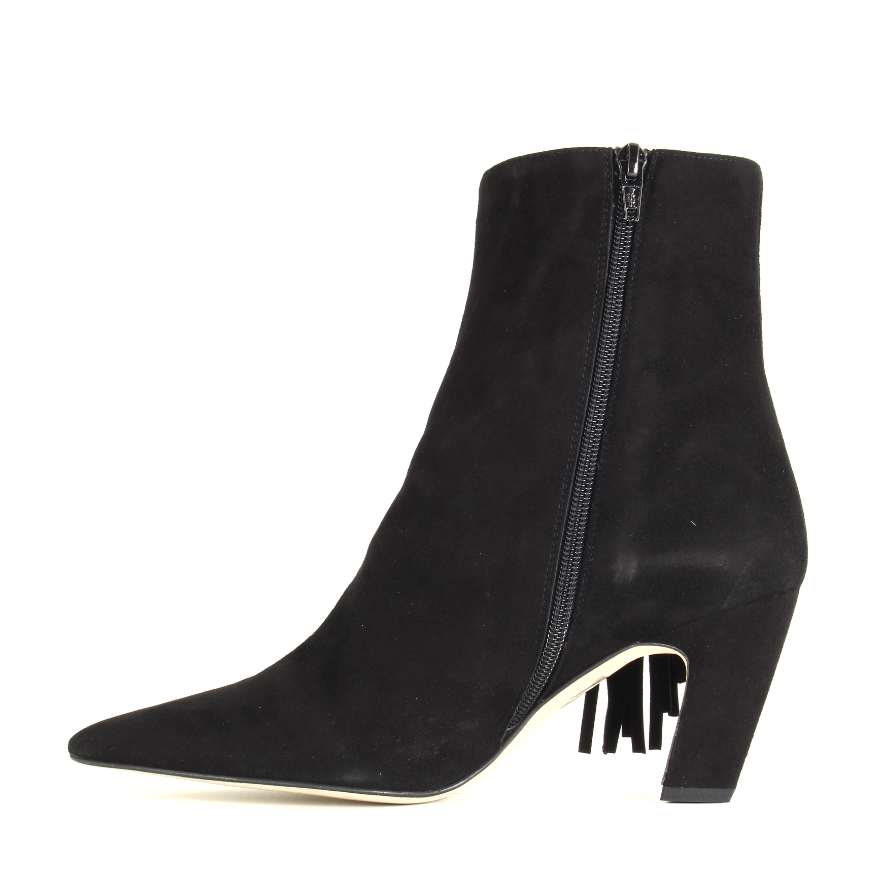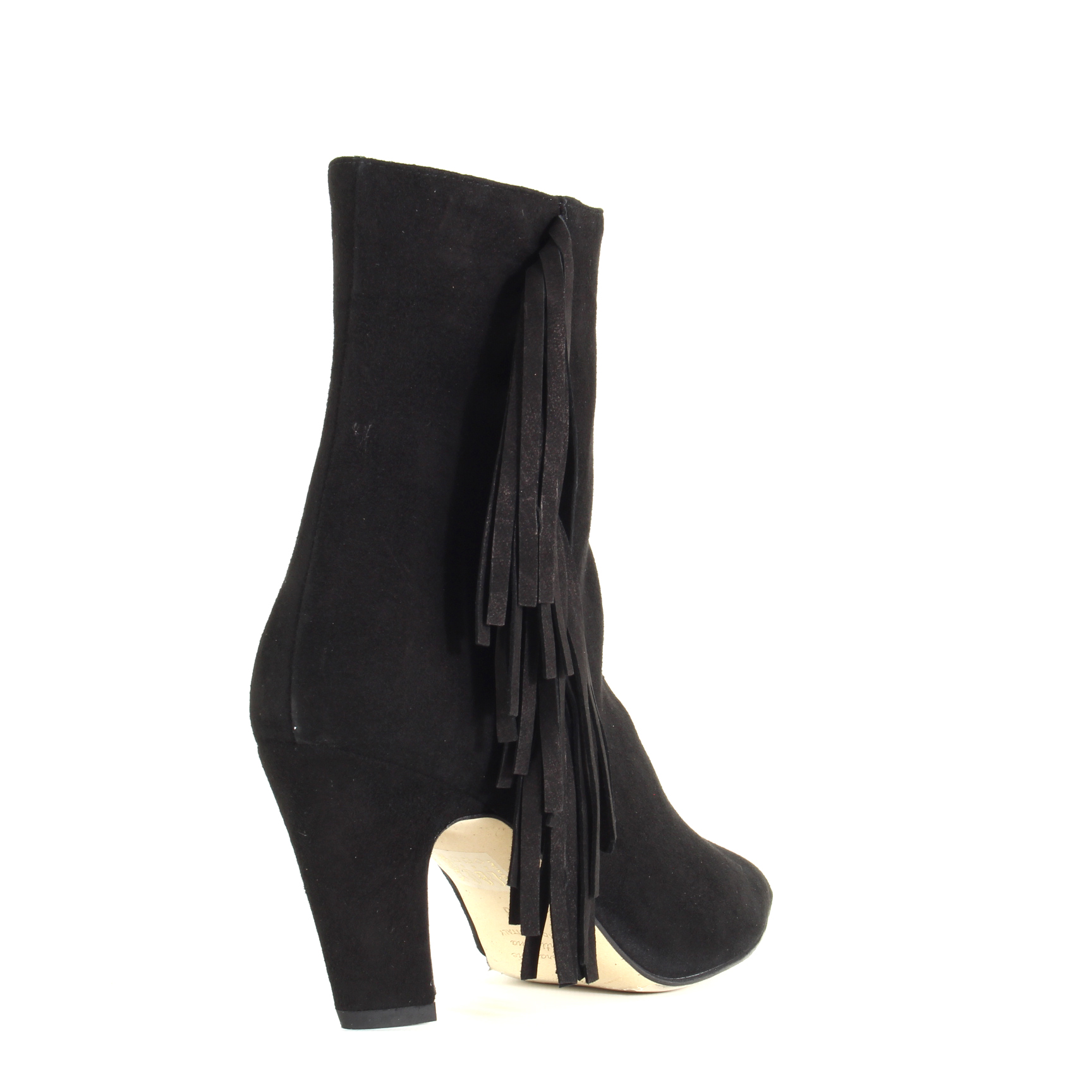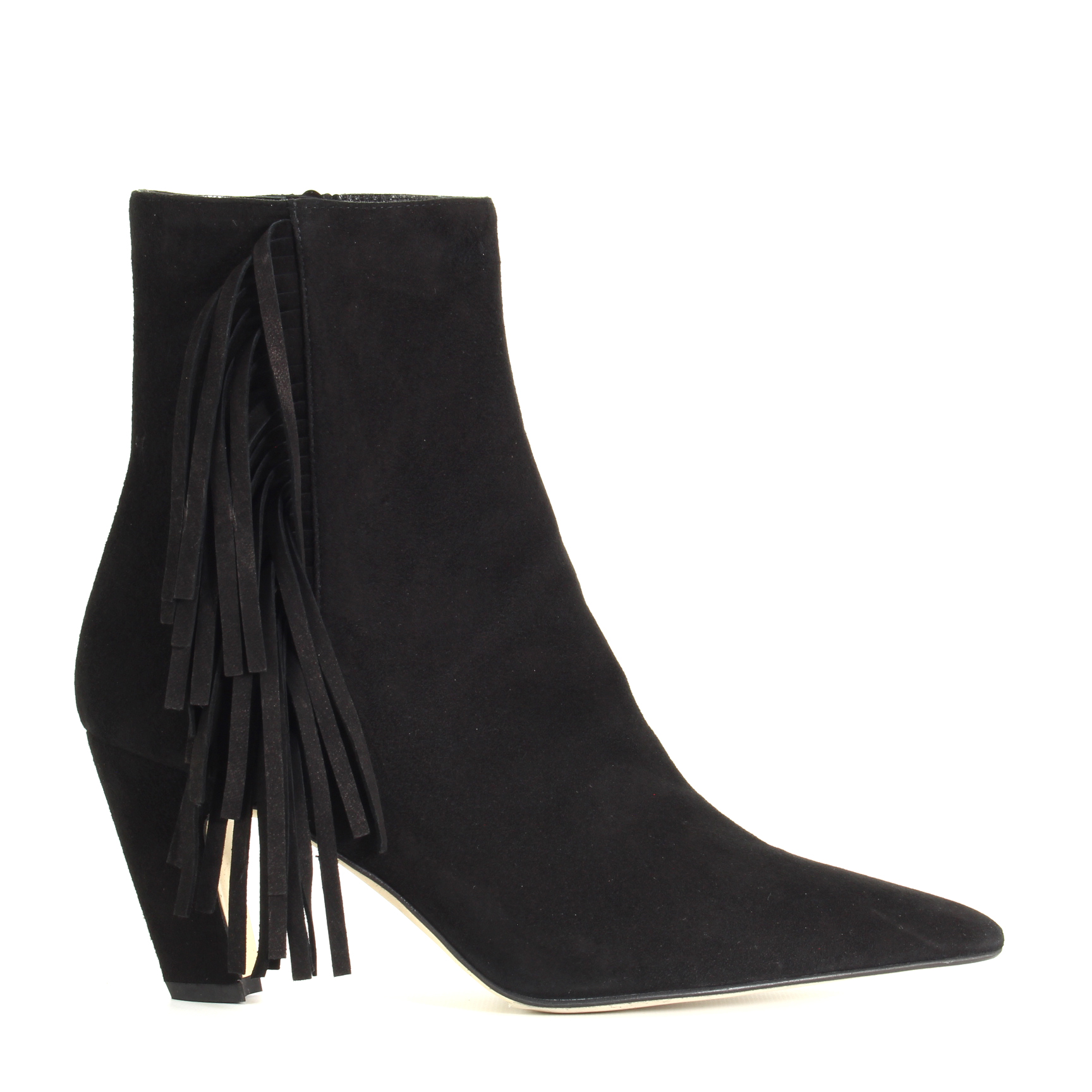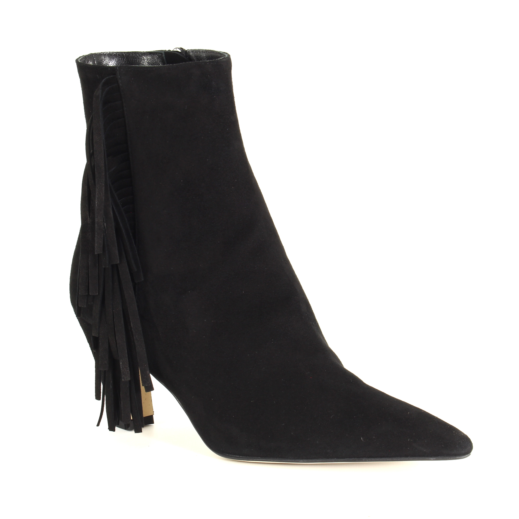 La punta affusolata allunga la gamba con naturalezza, mentre la frangia laterale aggiunge movimento e carattere: un dettaglio boho chic che si muove con te, discreto ma irresistibile. La zip sull’altro lato rende tutto pratico, senza sacrificare la bellezza del design. Il camoscio nero, morbido e profondo, assorbe la luce e regala texture, un’eleganza tattile che invita a essere sfiorata.