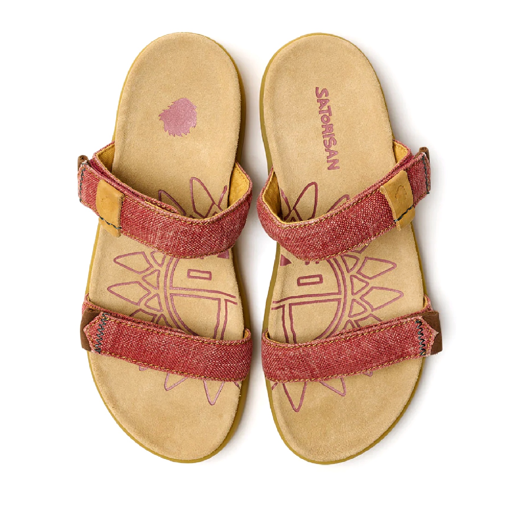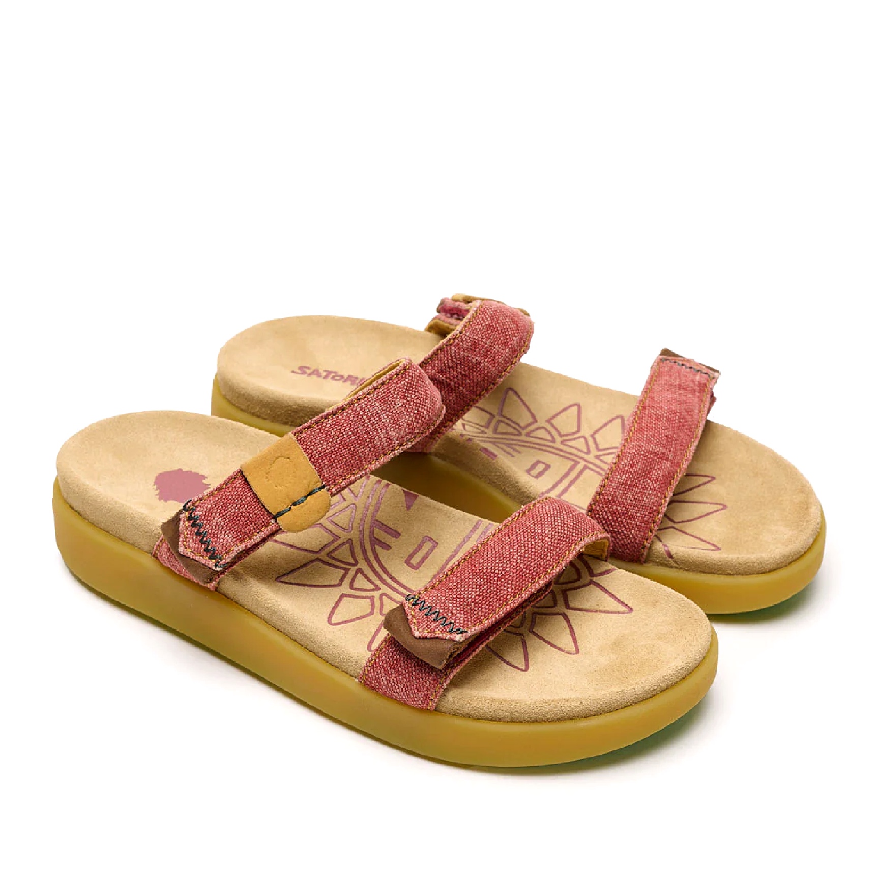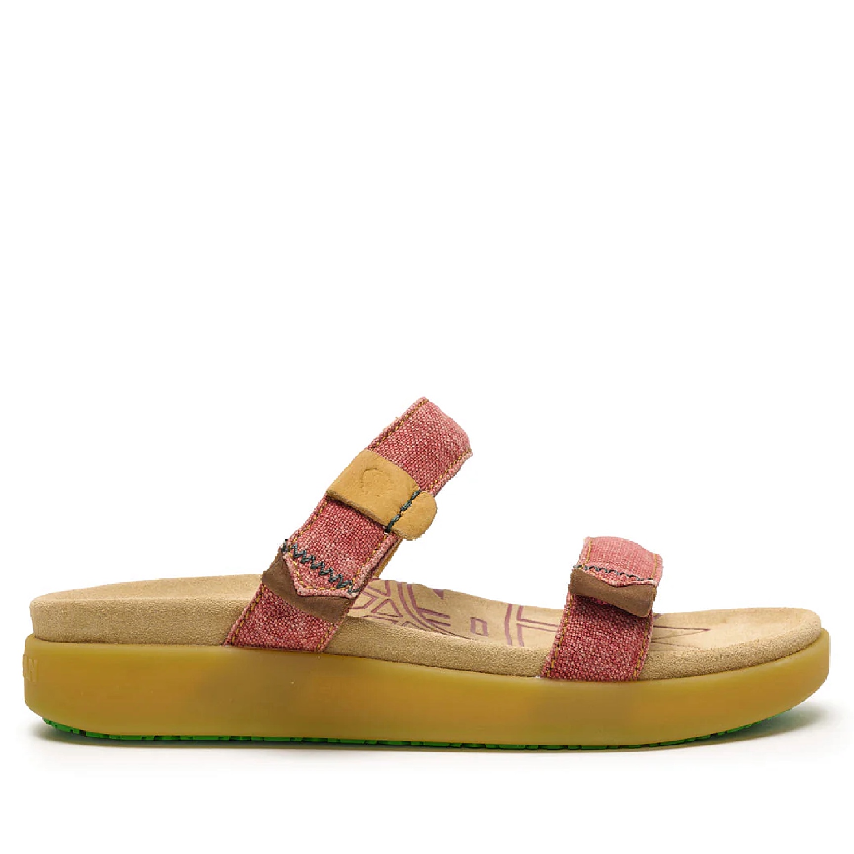 Tomaia in lino traspirante, con dettagli in pelle Vaqueta conciata al vegetale e cuciture a zig-zag colorate.