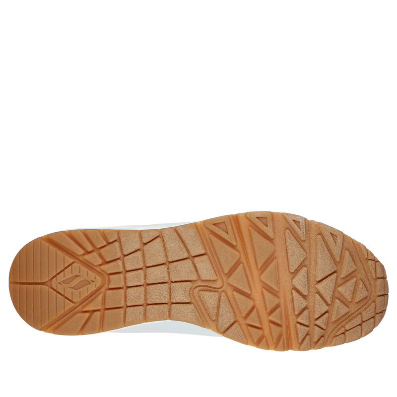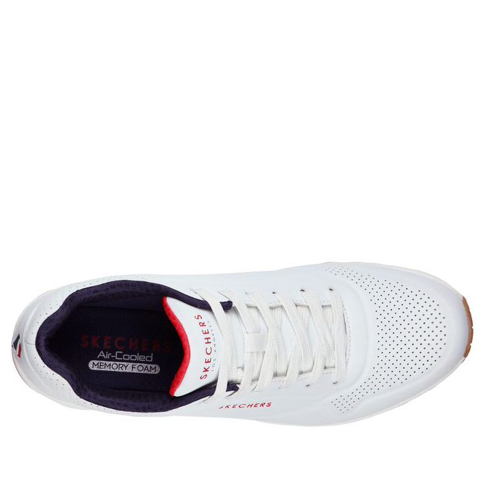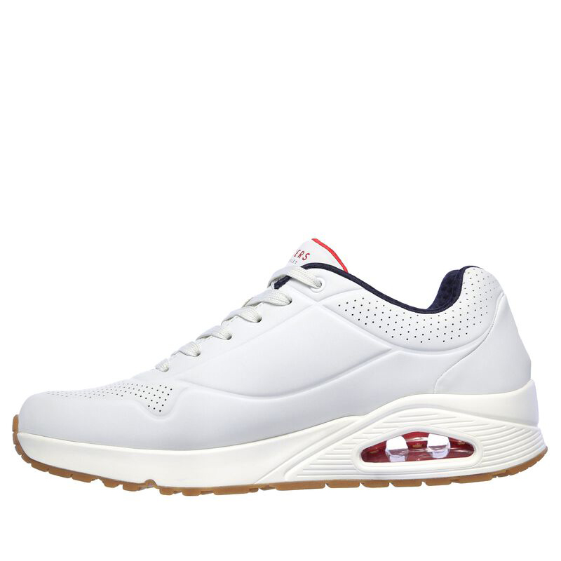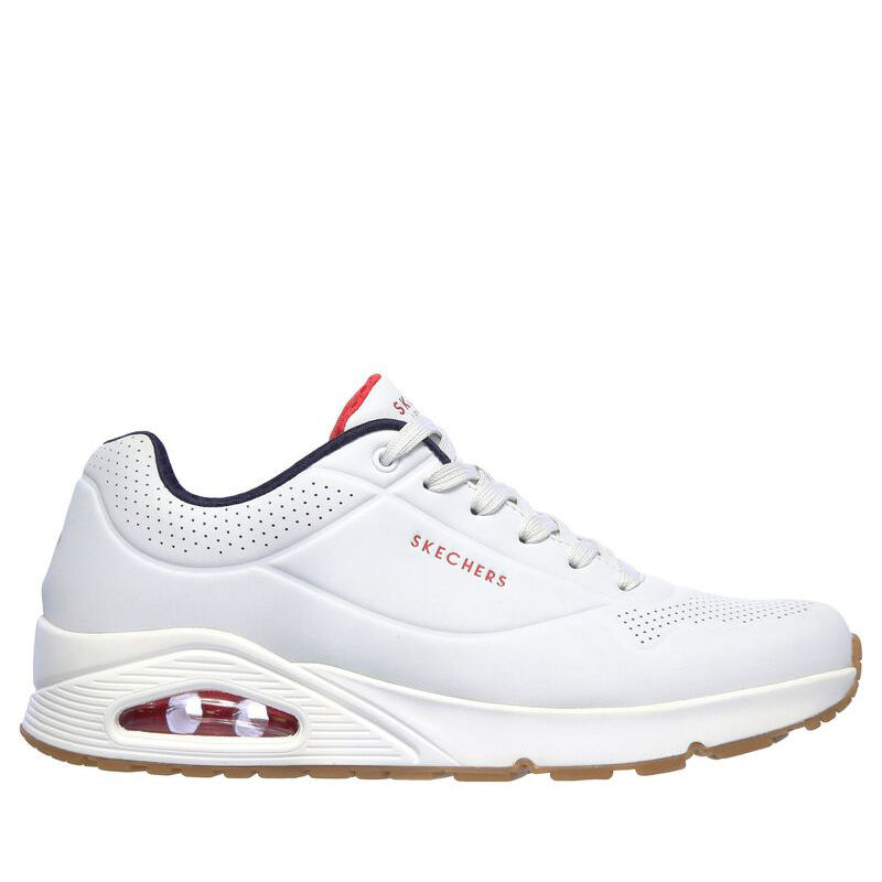Skechers Uno Stand on Air 52458. Lo stile classico con imbottitura ad aria viene rivisitato nella scarpa Skechers Street Uno - Stand on Air. Questo modello stringato di tendenza presenta una tomaia sintetica traforata liscia con soletta Air Cooled Memory Foam e intersuola ammortizzata ad aria con tecnologia visibile Skech-Air. Tomaia traforata in materiale sintetico liscio “durabuck. Suola in gomma che offre trazione