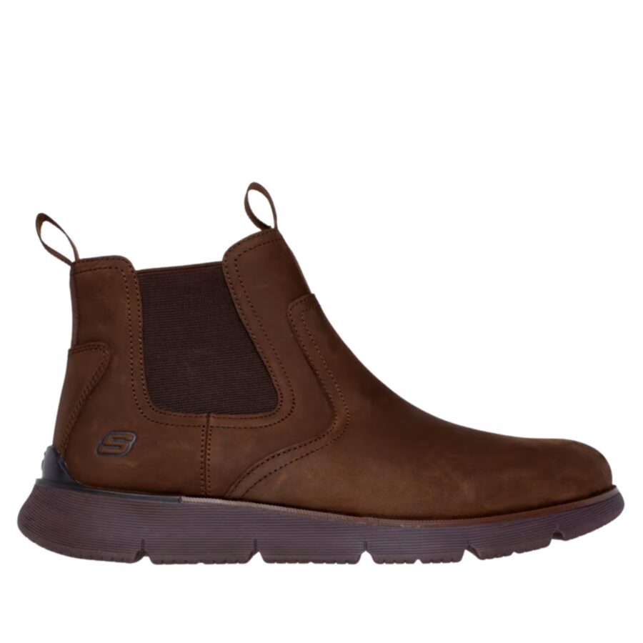 Lo stile moderno incontra il comfort esclusivo in Skechers Augustino - Paulo. Questo stivaletto Classic Fit™ presenta una tomaia in pelle con doppi pannelli in gore, una soletta Skechers Air-Cooled Memory Foam® infusa di carbone e un arco Skechers Goga Mat Arch™ per un supporto aggiuntivo.
