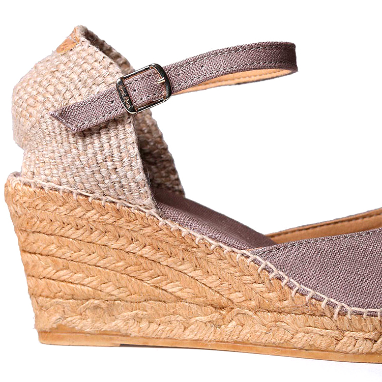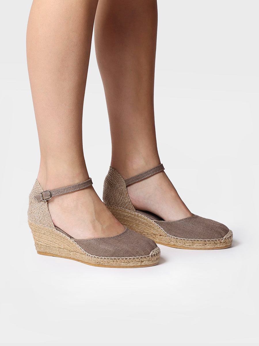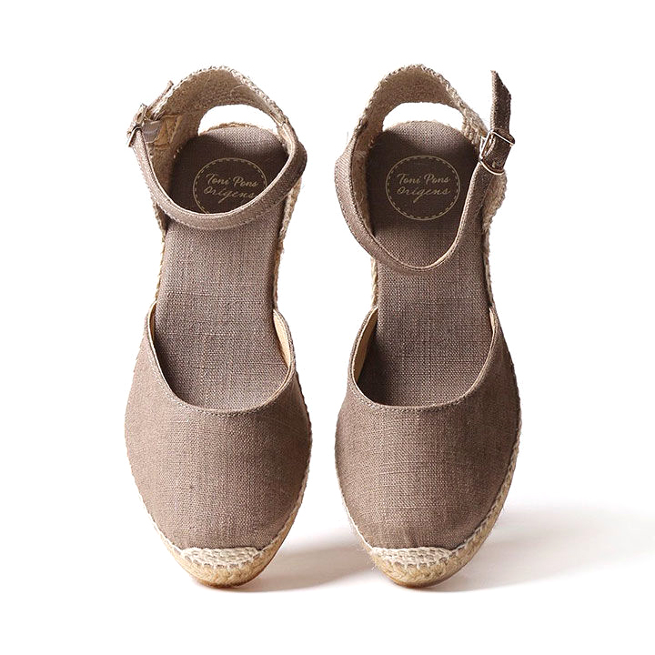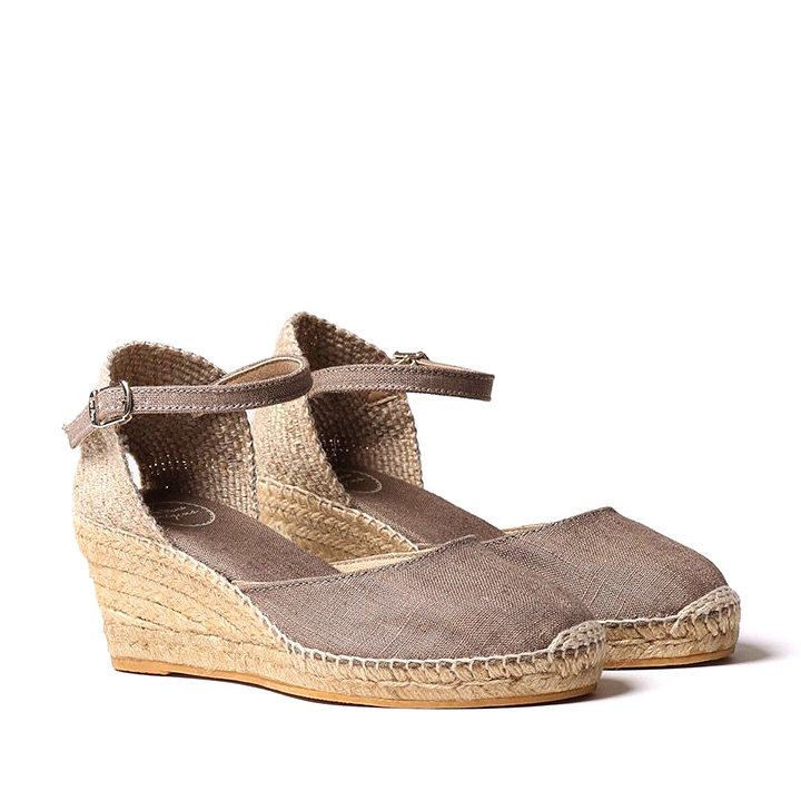 Espadrillas Caldes Tortora (Talpa), Toni Pons. Queste espadrillas con colori a tinta unita, con zeppa e chiusura con fibbia sono alte complessivamente 7 cm. dei quali 5 corrispondono al tacco e 2 al plateau. La zeppa è in juta e la soletta interna è foderata in tessuto. La talloniera è in tessuto intrecciato. L’unione del tessuto e della suola è cucita a mano con filo di cotone e ha un rinforzo sulla punta per un maggior sostegno. La suola è in gomma antiscivolo. È un modello vegano al 100% poiché non contiene materiali di origine animale. Questo modello indossa la taglia comune, se sei indecisa tra due taglie ti consigliamo di scegliere la taglia più grande. Colore: Tortora TOMAIA: Lino MATERIALE SOTTOPIEDE: Tessuto