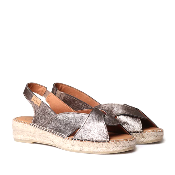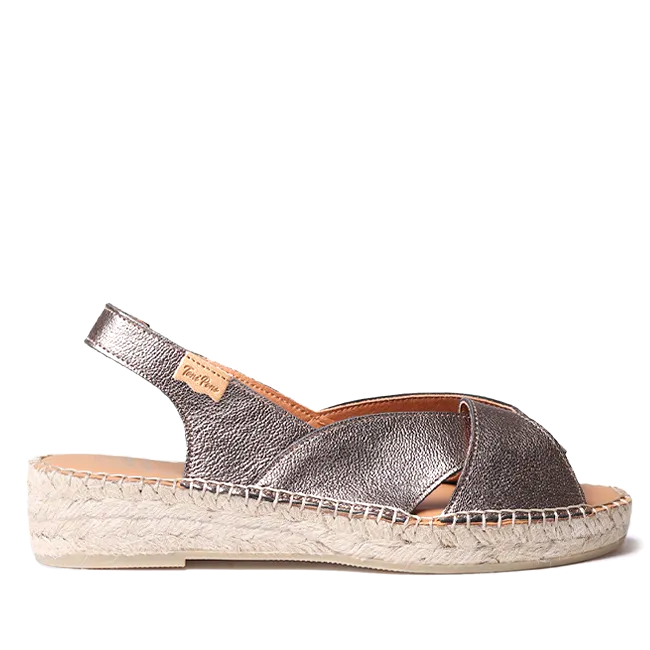 Toni Pons ENOLA-P. Queste espadrillas da donna sono realizzate in pelle. La zeppa in iuta ha un'altezza totale di 3,5 cm. La suola è realizzata in gomma antiscivolo. Si tratta di un modello con tacco e punta aperti. La soletta interna è foderata in pelle per il massimo comfort. Questo modello è cucito a mano in Spagna. Questo modello veste la taglia classica, se si ha una taglia intermedia si consiglia di scegliere quella più grande.