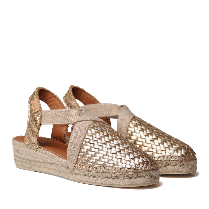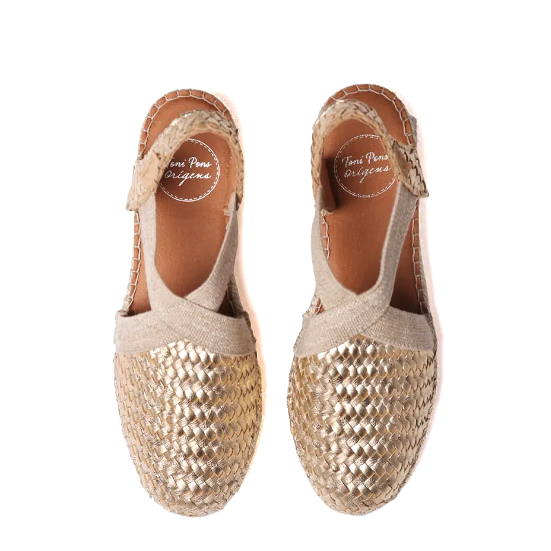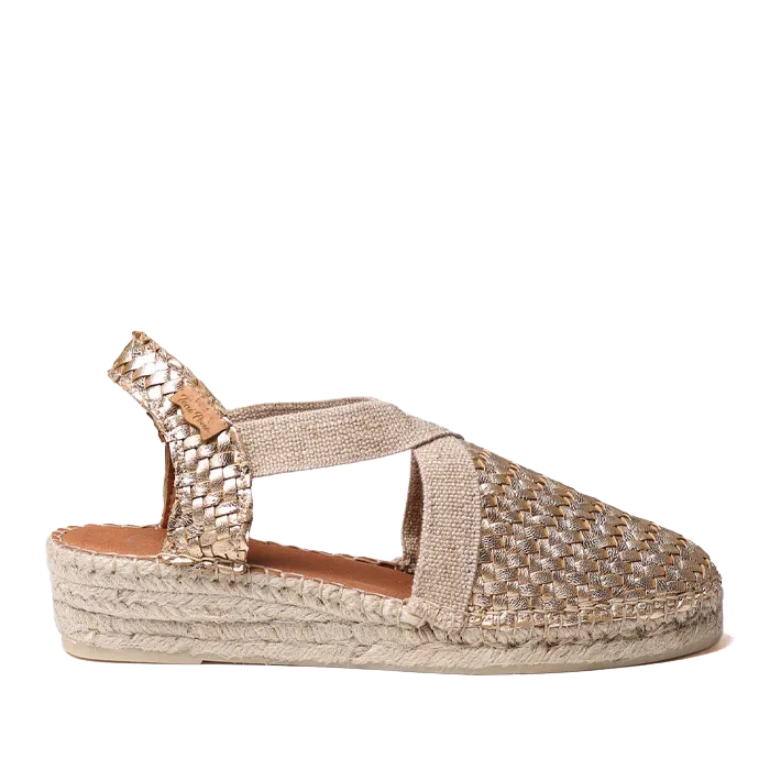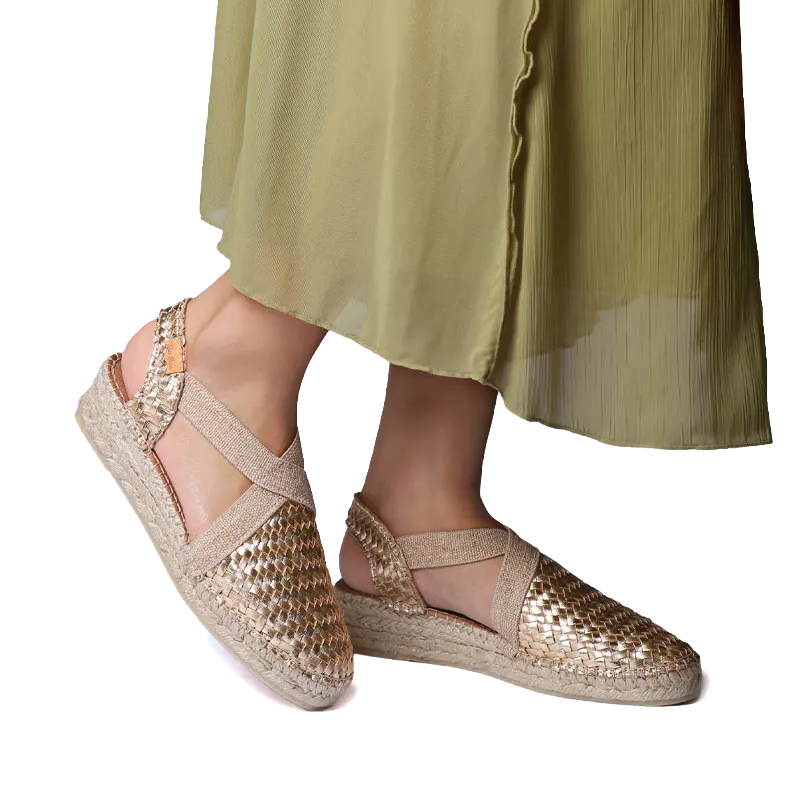 SIRACUSA. Queste espadrillas chiuse da con zeppa sono realizzate in pelle intrecciata. La zeppa in iuta ha un'altezza totale di 3 cm. La base della suola è realizzata in gomma antiscivolo. La suola interna è rivestita in tessuto imbottito che conferisce grande comfort. Hanno due elastici incrociati nella parte superiore del piede per una corretta allacciatura. Si tratta di un modello cucito a mano in Spagna. Questo modello veste la taglia classica, se si ha una taglia intermedia si consiglia di scegliere quella più piccola.