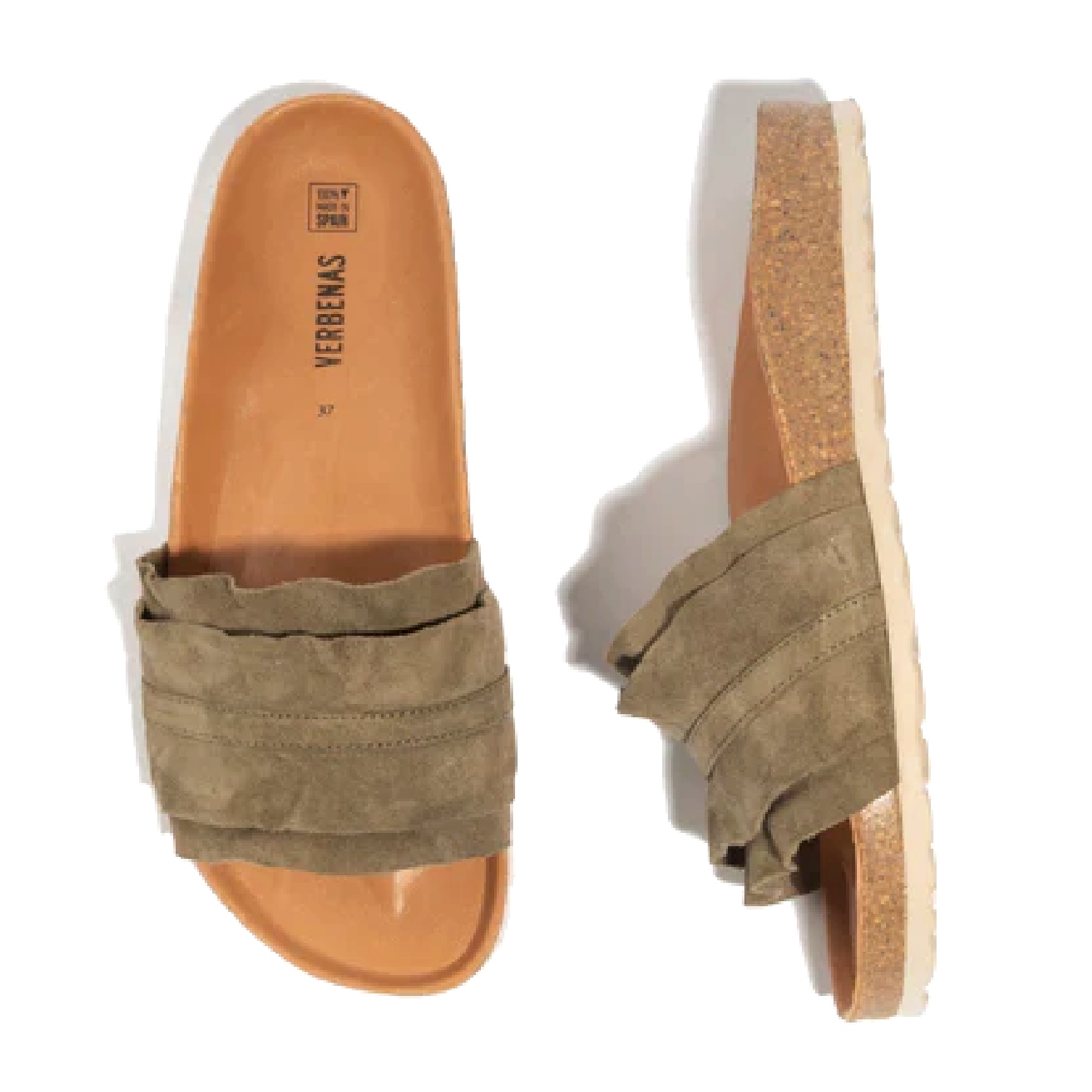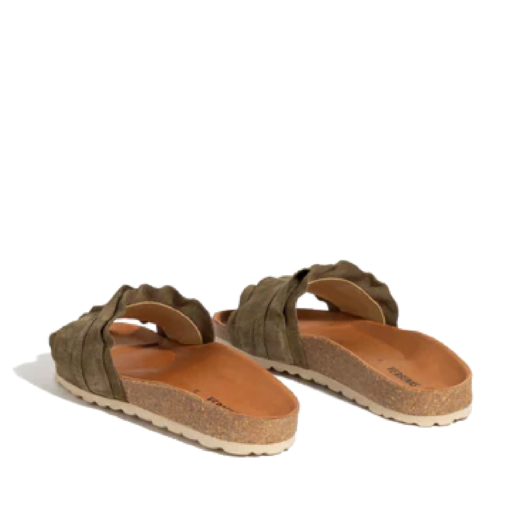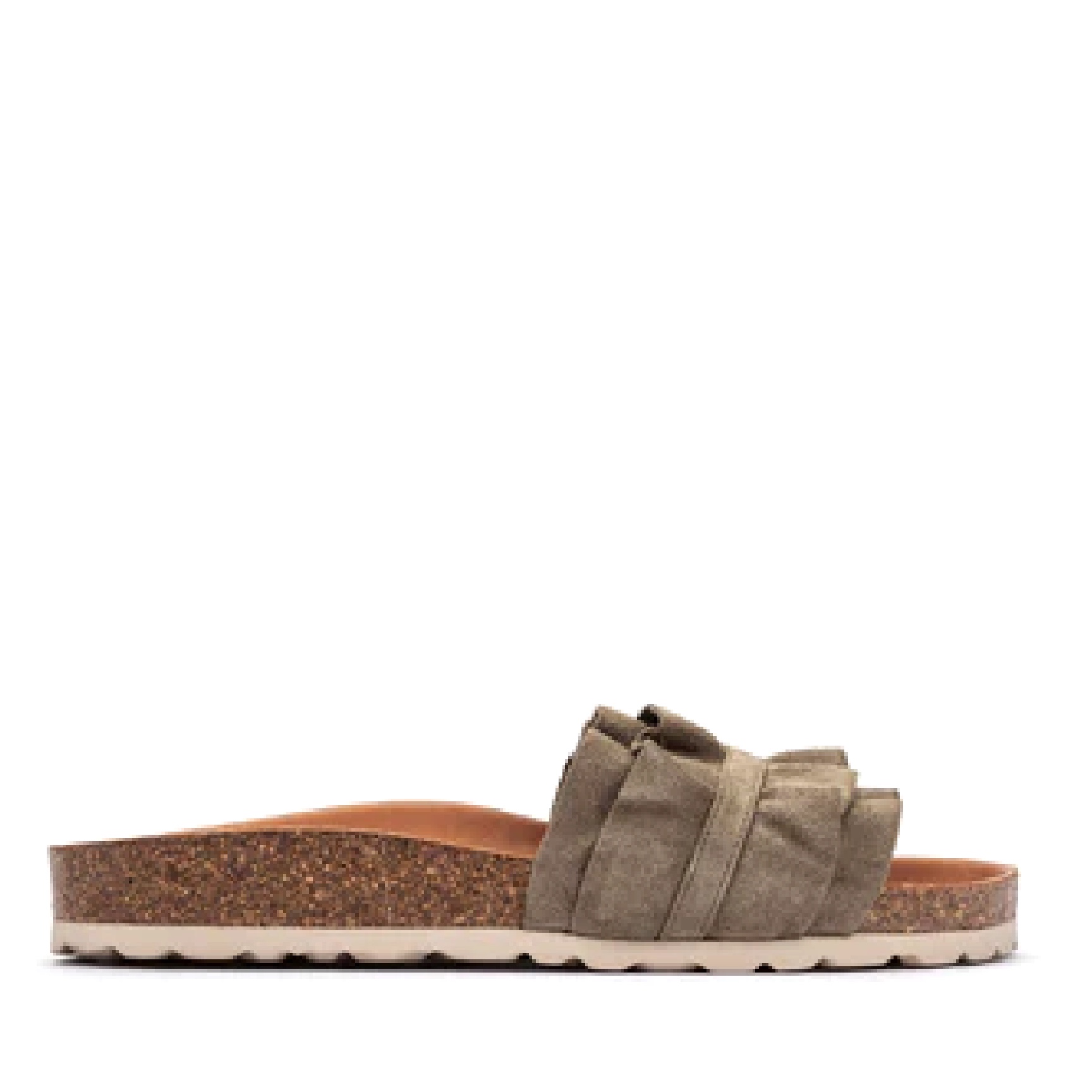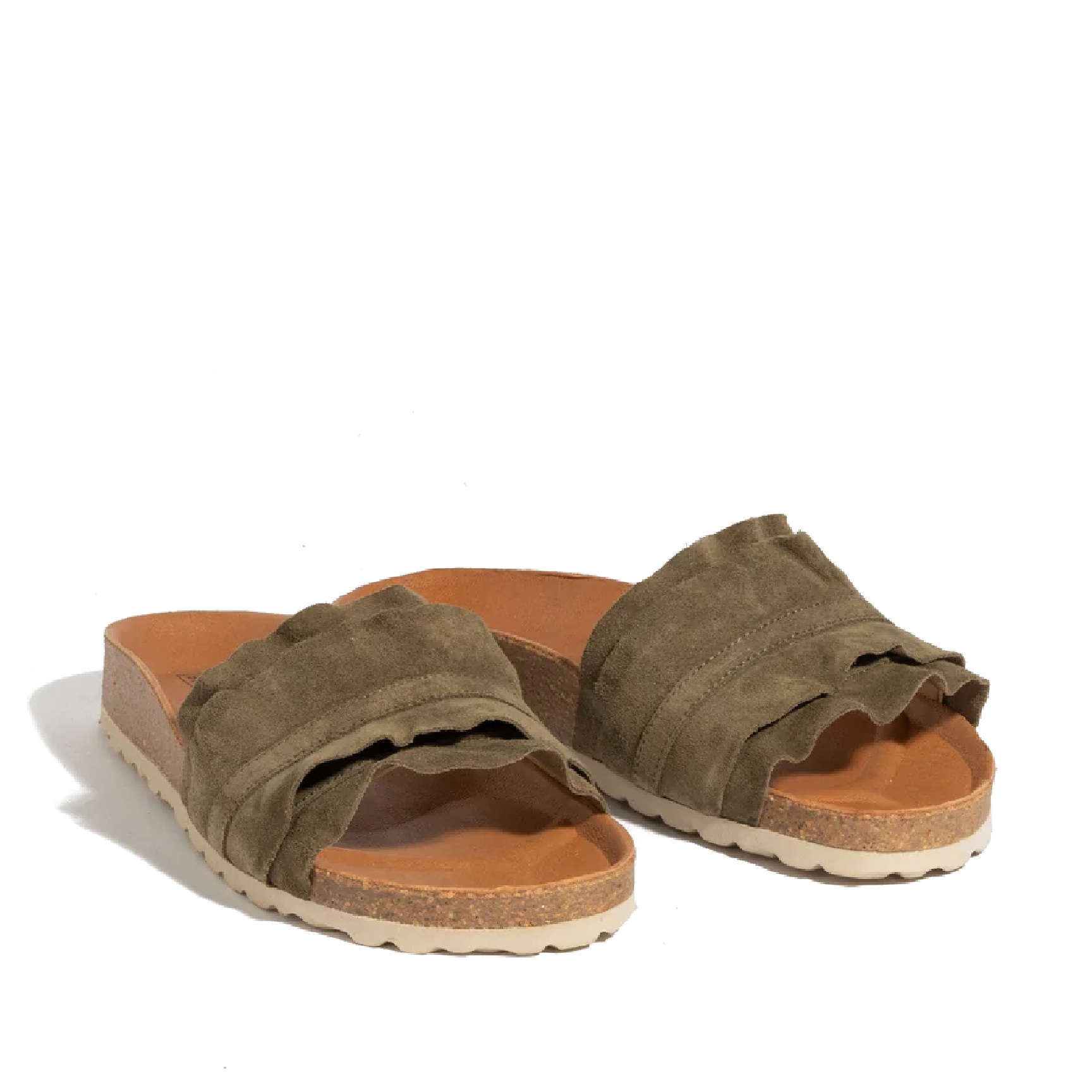 Sandali Rocio Volante in color verde cachi. Realizzati in crosta scamosciata, fodera e suola in pelle e suola in gomma e sughero.