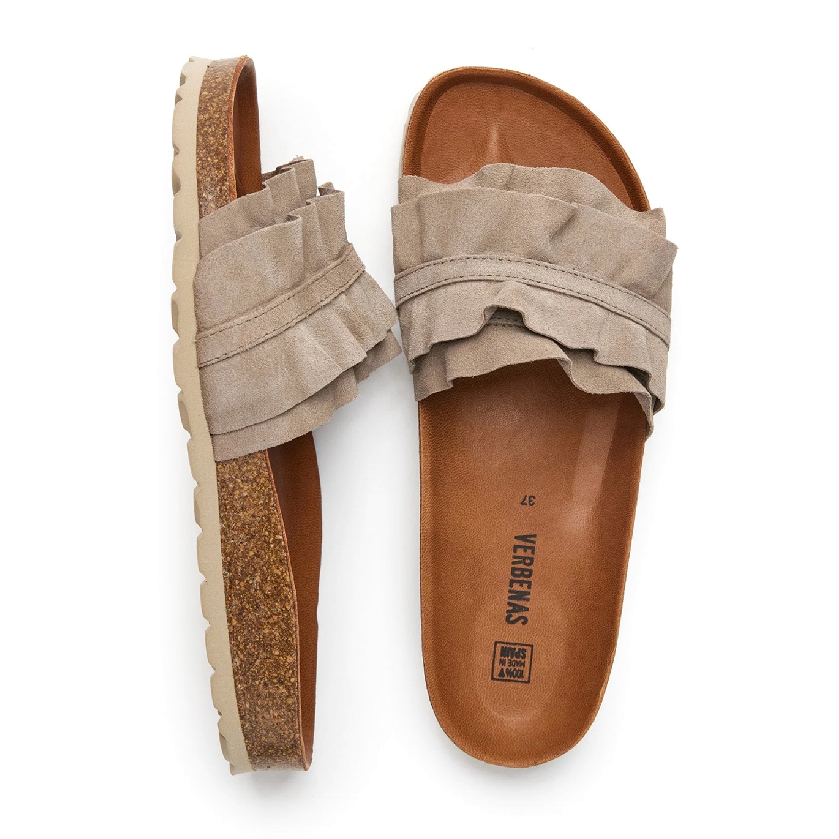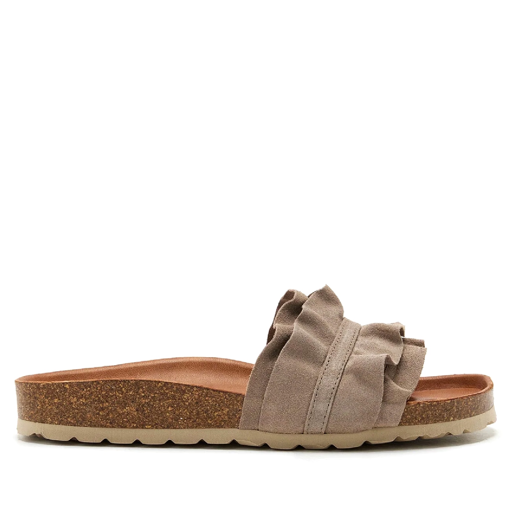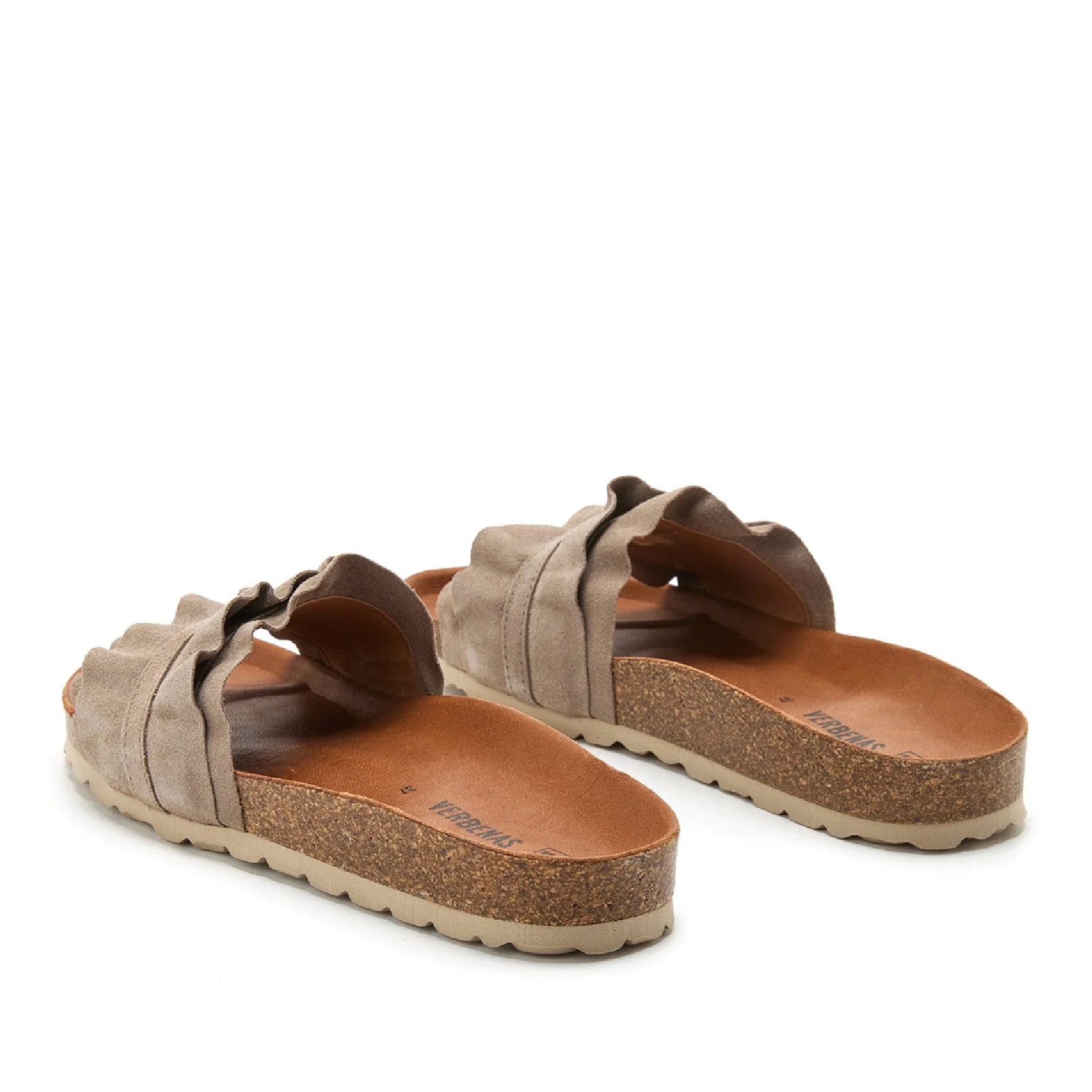 Sandali Rocio Volante in color beige (piedra). Realizzati in crosta scamosciata, fodera e suola in pelle e suola in gomma e sughero.