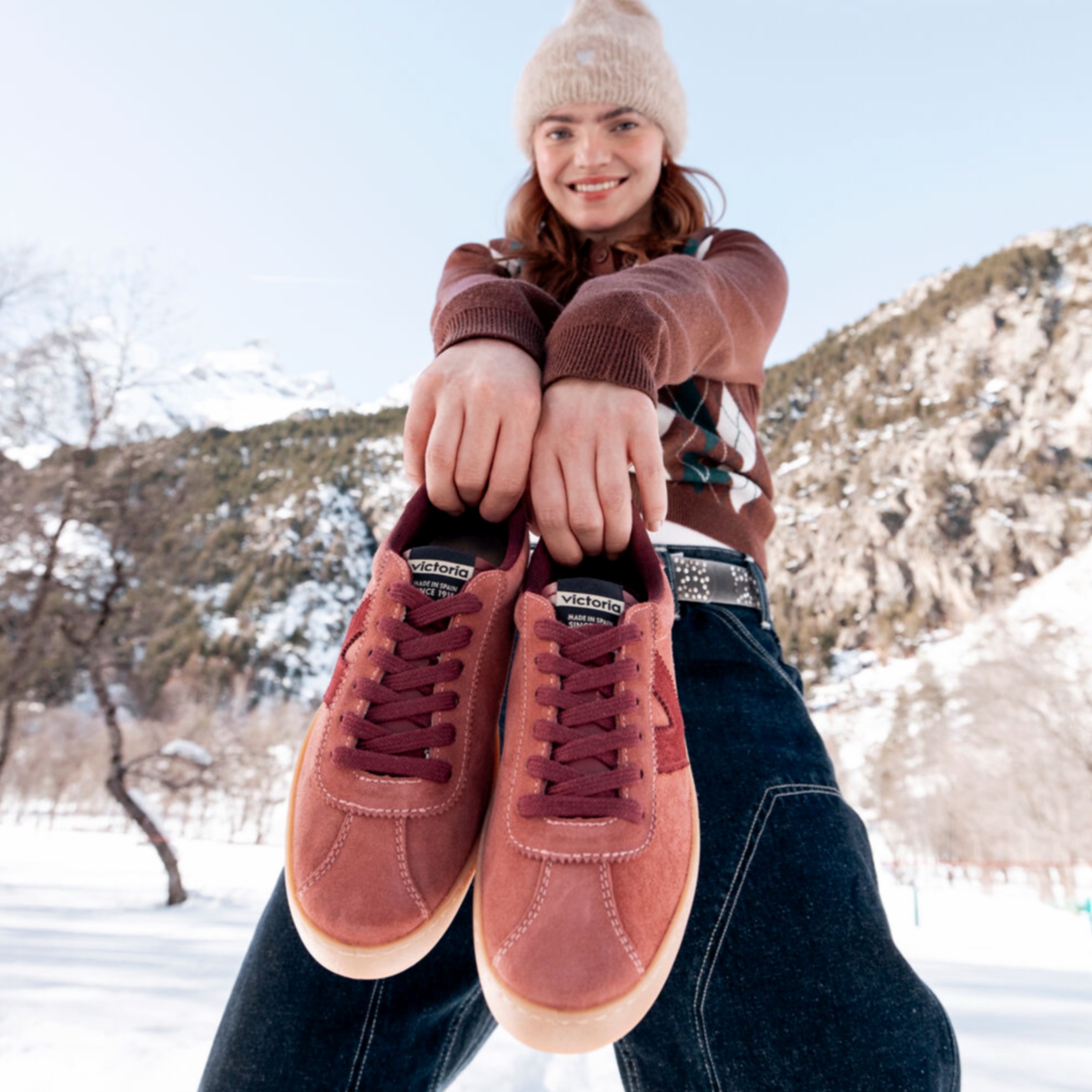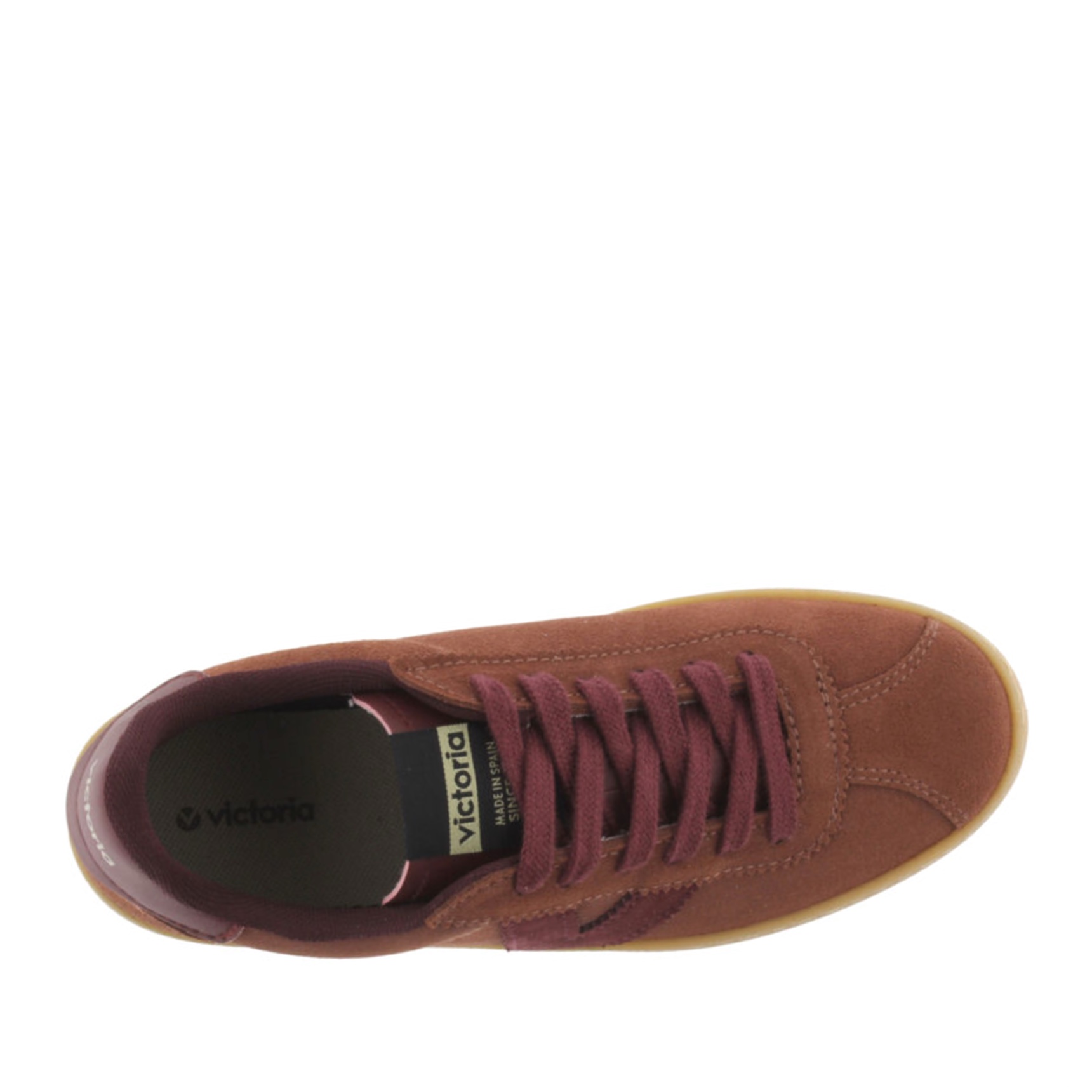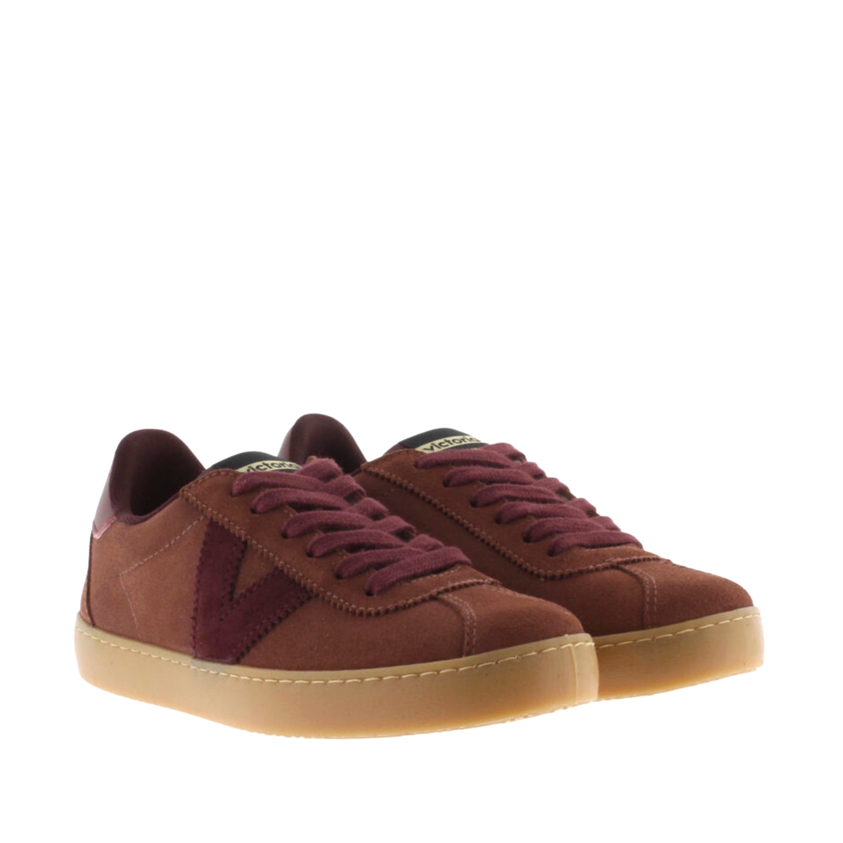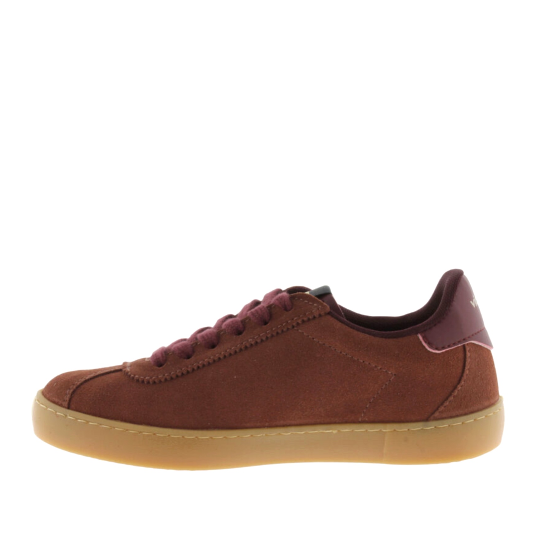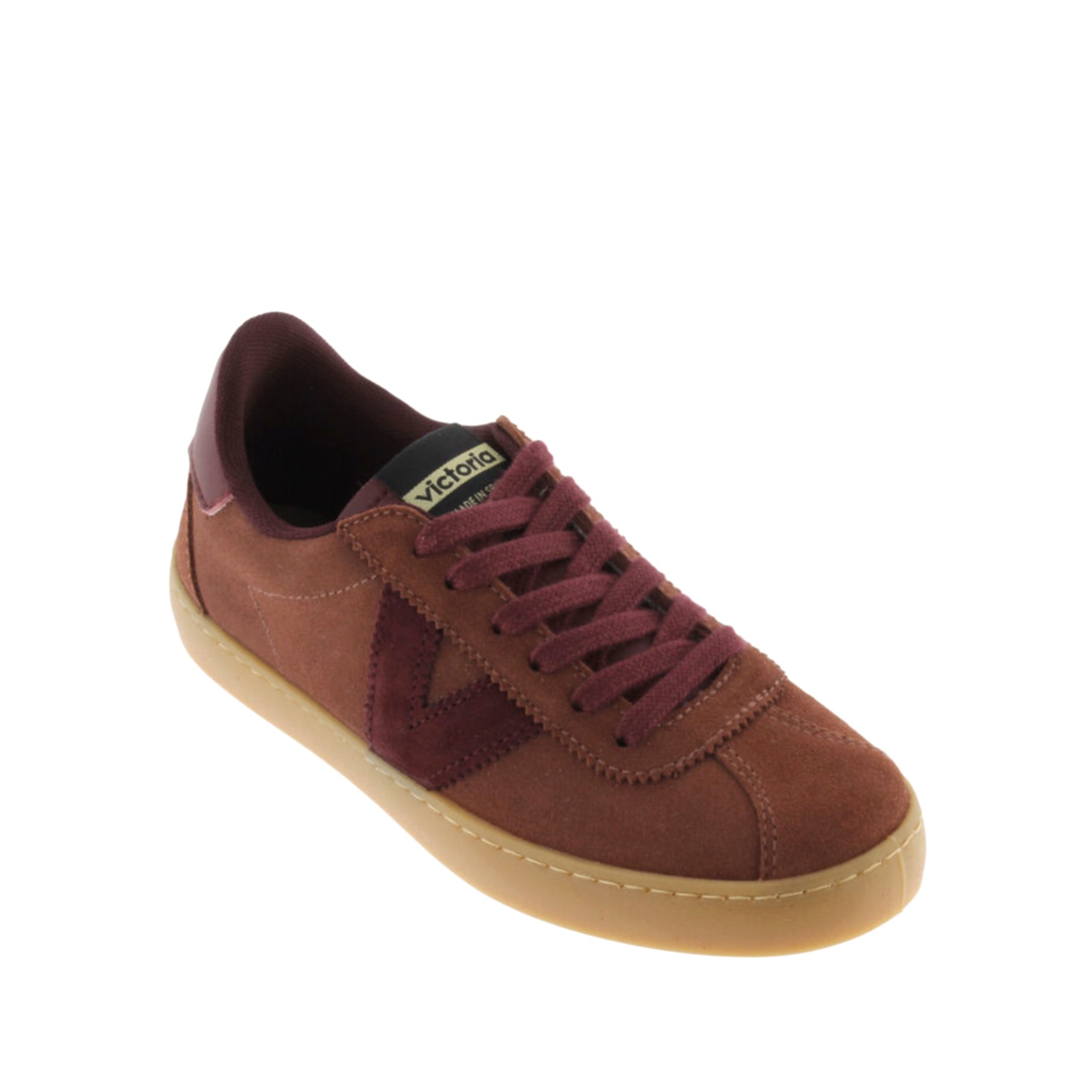 Una sneaker bassa Made in Spain in morbida pelle con punta in split leather e logo “V” laterale in tonalità terra (marrone), coordinato al dettaglio sul retro
