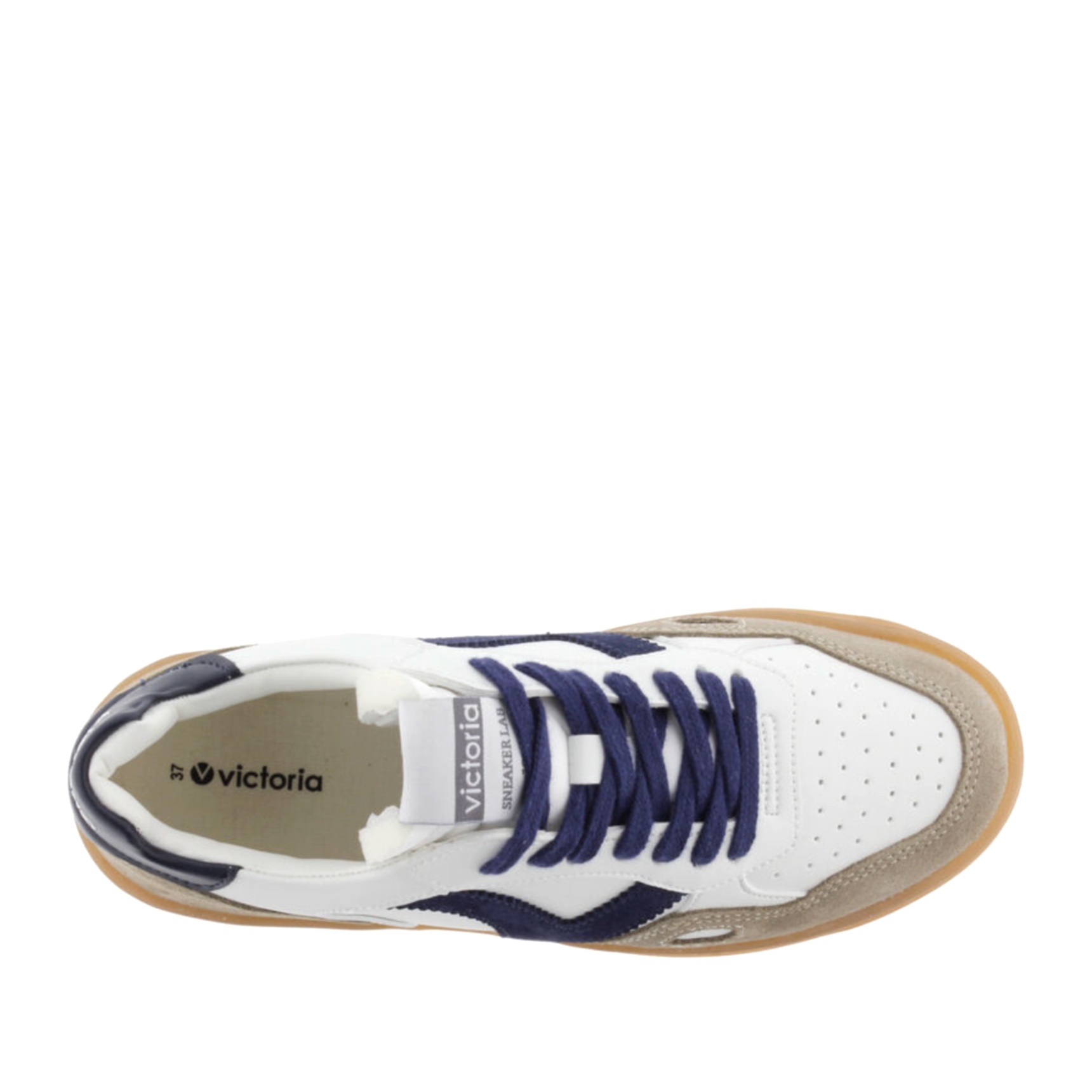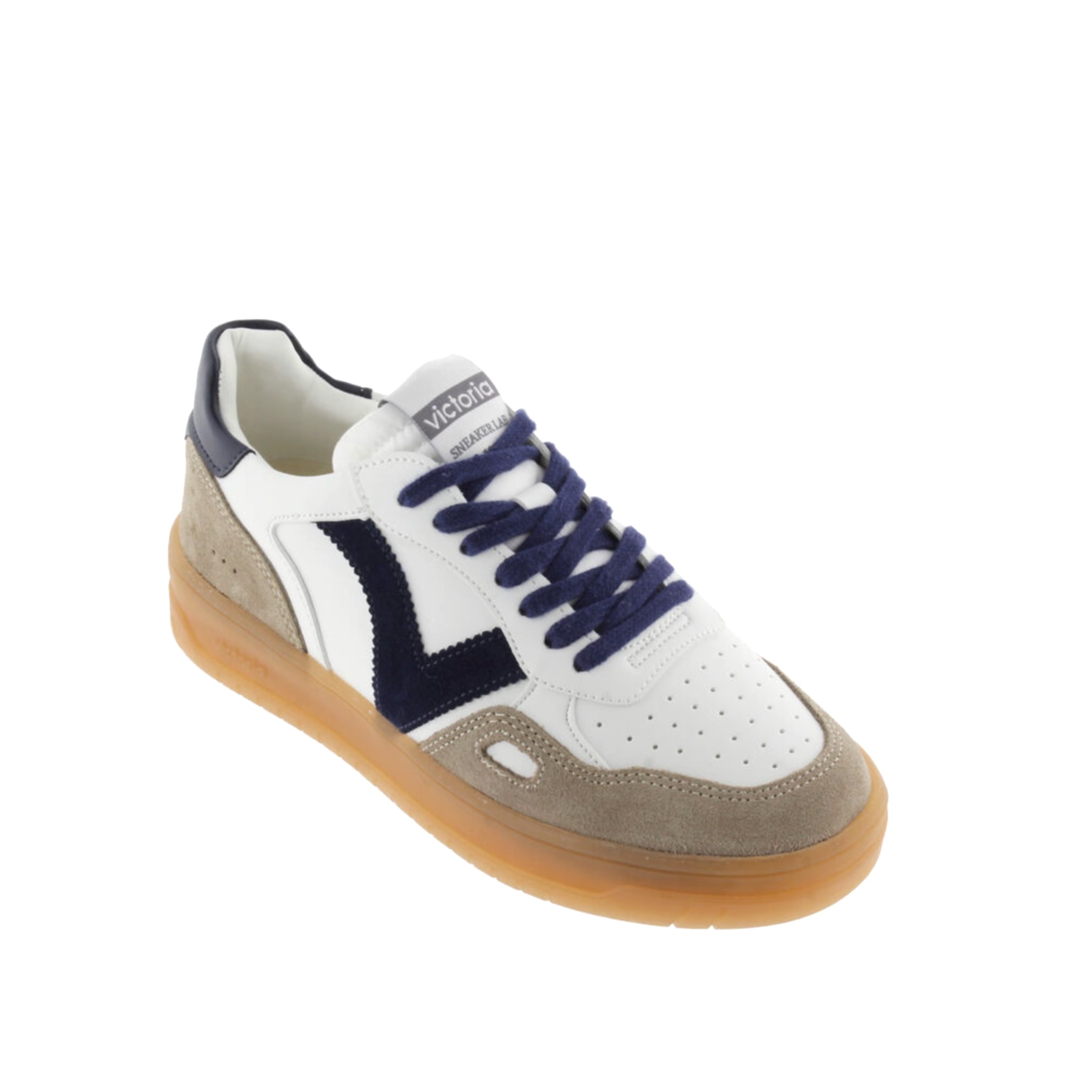 Sneakers sportive bianche unisex realizzate in materiale effetto pelle e inserti in crosta di pelle. Dettagli colorati nella V laterale e nell'inserto posteriore con il logo del marchio, coordinati con i lacci. Dettaglio a finestra sul lato. Suola color caramello di 3,5 cm. Comprendono una soletta estraibile imbottita per un maggiore comfort.