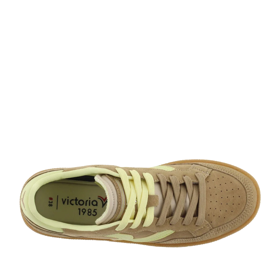 Scarpe sportive unisex realizzate in effetto pelle con inserti in camoscio effetto "velluto" tono su tono. Chiusura con lacci bicolore: alcuni tono su tono e altri abbinati alla parte posteriore. Fodera in microfibra traspirante. Suola in gomma color caramello. Include inoltre una soletta ergonomica che si adatta alla forma del piede, offrendo una sensazione di comfort.